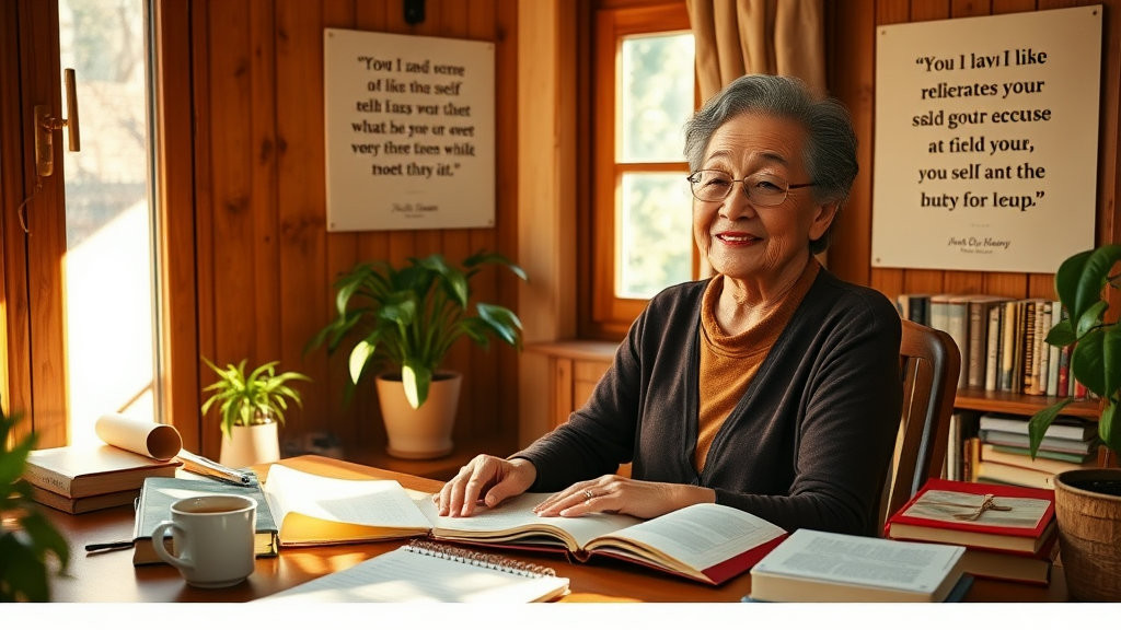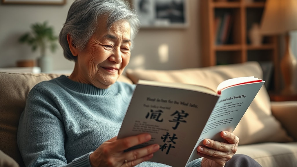 이미지 핵심 정보 : 내적 평화, 감사, 가화만사성, 법문의 영향, 노년 여성.