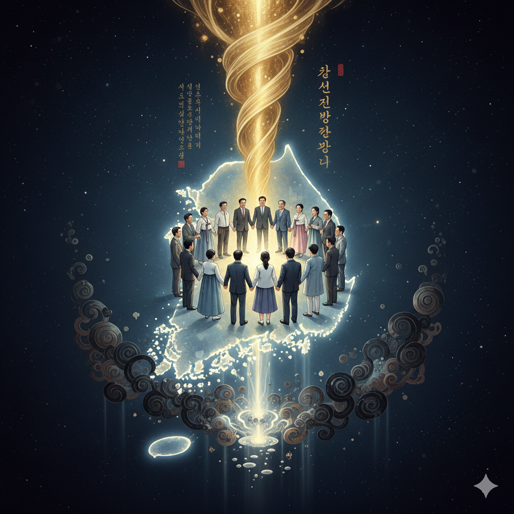 Image Prompt (English): In a serene cosmic space, a luminous map of South Korea floats spiritually. Neatly dressed people of diverse nationalities and ages hold hands, moving towards a common goal. Wisdom symbols (books, lotus flowers, light) float around them, as energy of hope and harmony spreads across the Earth. The background is a Nanobanana-style East Asian painting collage blending peaceful landscapes with modern cityscapes.