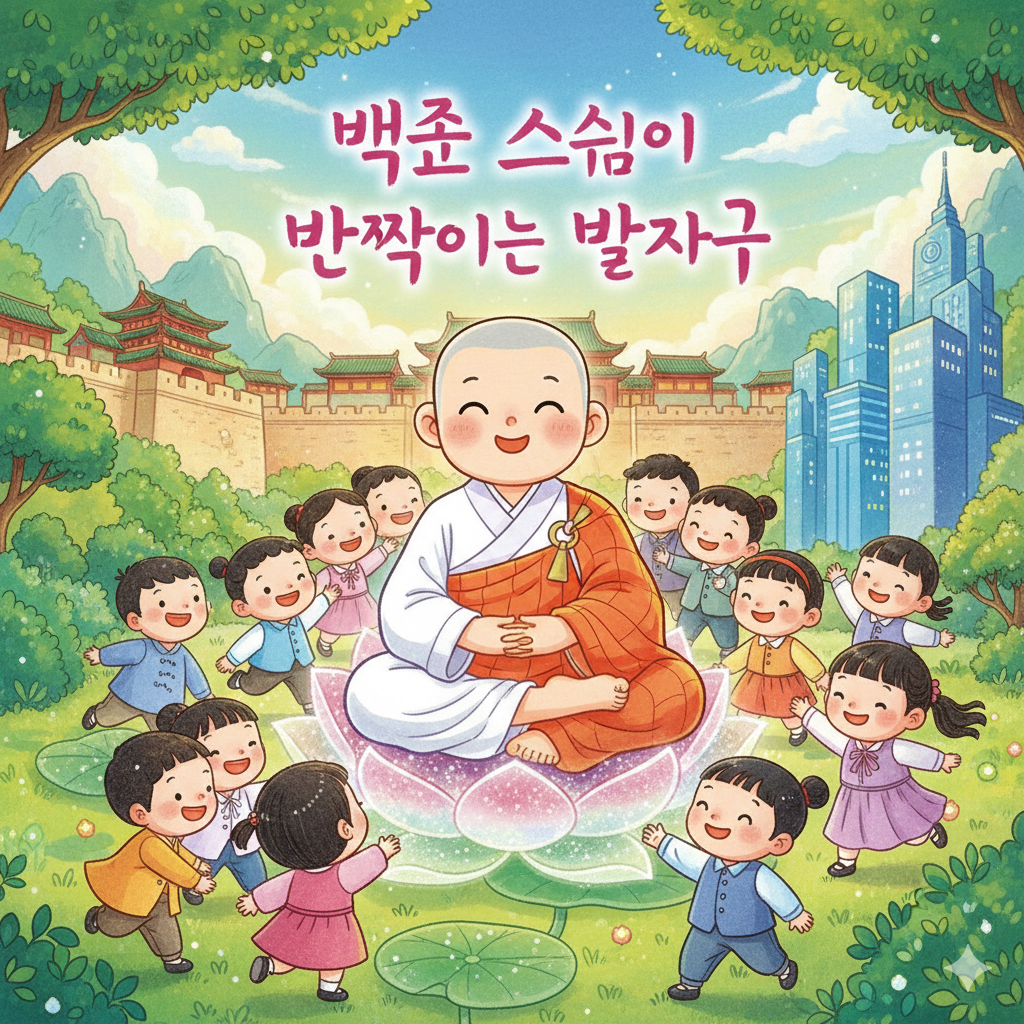 한글: 밝고 희망찬 어린이 그림책 스타일의 "구글 나노 바나나". 반짝이는 투명한 연꽃 위에 밝게 웃는 담시 스님(단정하고 귀여운 승복)이 앉아 있고, 스님의 발은 깨끗하게 빛나고 있습니다. 스님 주변으로는 여러 나라에서 온 귀여운 아이들(깔끔한 옷차림)이 스님을 바라보거나 손을 잡고 행복하게 놀고 있습니다. 배경은 고구려의 초록 숲, 중국의 아기자기한 성벽, 그리고 현대 도시의 반짝이는 건물들이 동화처럼 어우러져 있습니다. 제목 '백족 스님의 반짝이는 발자국'이 예쁜 손글씨체로 쓰여 있습니다. English: Bright and hopeful children's picture book style "Google Nano Banana". Monk Damshi (in neat, cute monk's robes) sits smiling brightly on a sparkling, translucent lotus, his feet glowing cleanly. Around him, cute children (in neat clothes) from various countries look at him or hold hands and play happily. The background blends Goguryeo's green forests, China's charming city walls, and shimmering modern city buildings in a fairytale-like harmony. The title 'Monk Baekjok's Shining Footprints' is written in a beautiful handwritten font.