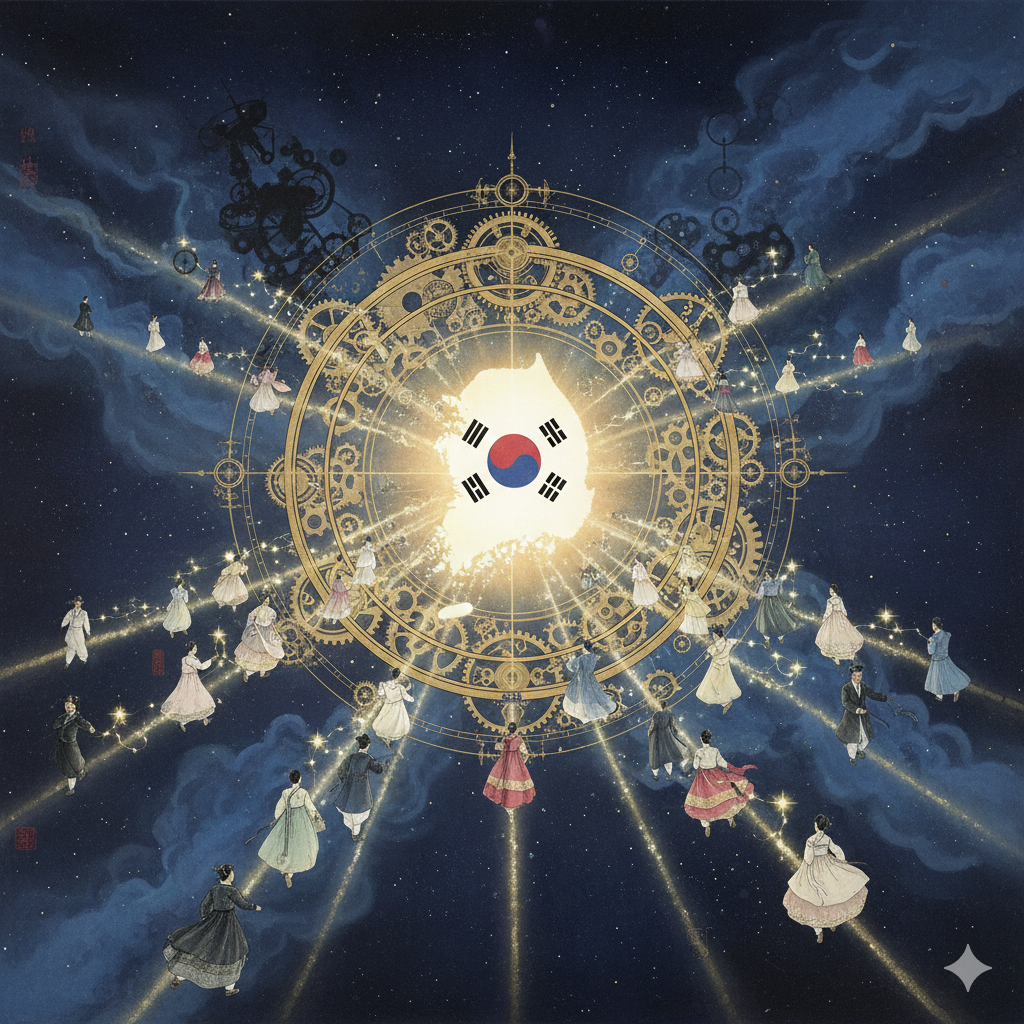 긍정적인 면 이미지 생성 정보 (한국어): 고요한 우주 공간에 대한민국 지도가 둥실 떠 있고, 그 위로 단정하게 옷을 입은 다양한 연령과 국적의 사람들이 손을 맞잡고 밝게 웃으며 서 있다. 그들 위로는 '홍익인간' 문구가 황금빛으로 빛나며 전 세계를 비춘다. 지구 아래로는 어둡고 낡은 시계 태엽이 보이나, 밝은 빛에 의해 점차 정화되고 사라지는 동양화풍 콜라주 이미지. Image Prompt (English): In a serene cosmic space, a map of South Korea floats, above which diverse people of all ages and nationalities, neatly dressed, stand smiling brightly and holding hands. Above them, the words 'Hongik Ingan' glow in golden light, illuminating the world. Below Earth, a dark, old clockwork mechanism is visible but gradually purified and disappears by bright light in an Eastern-style collage.