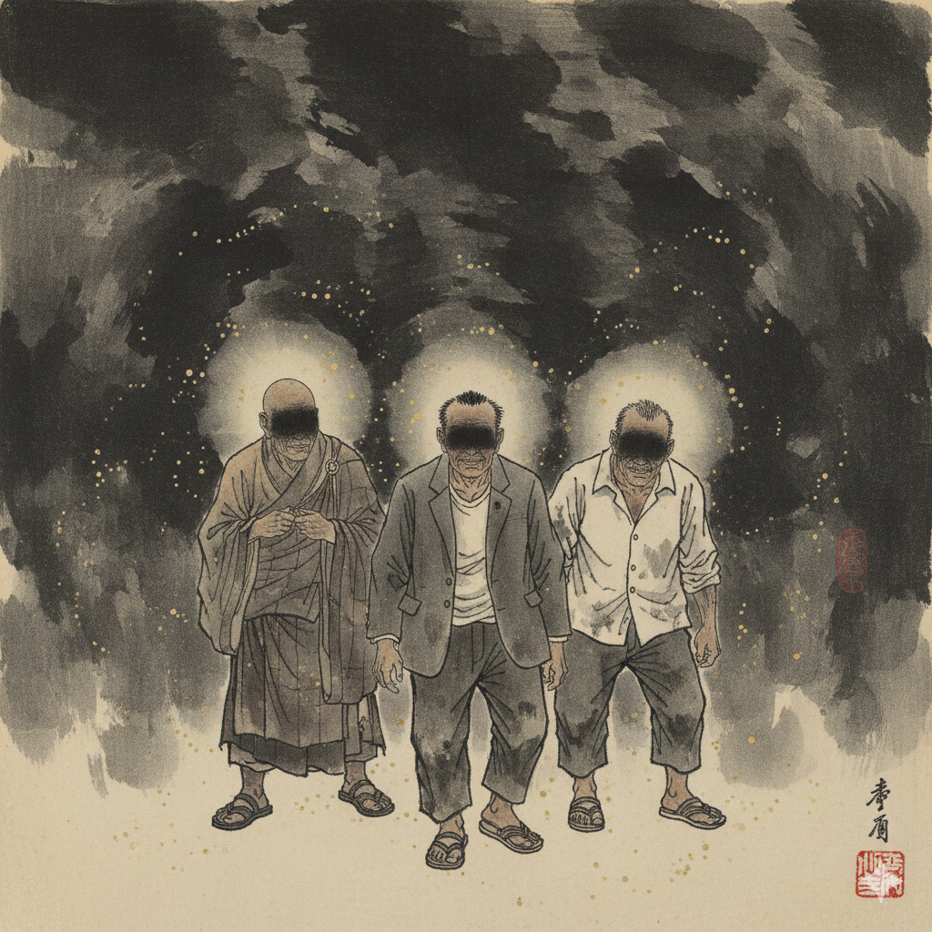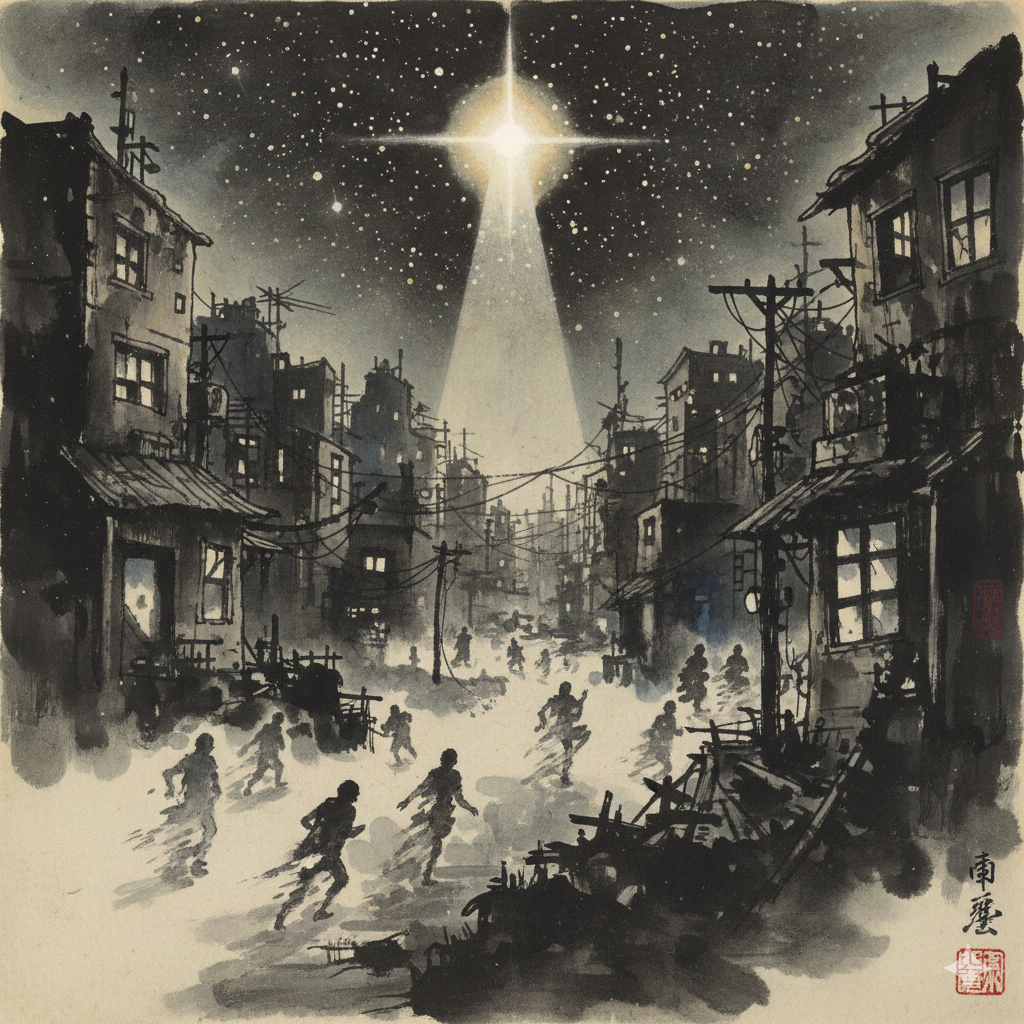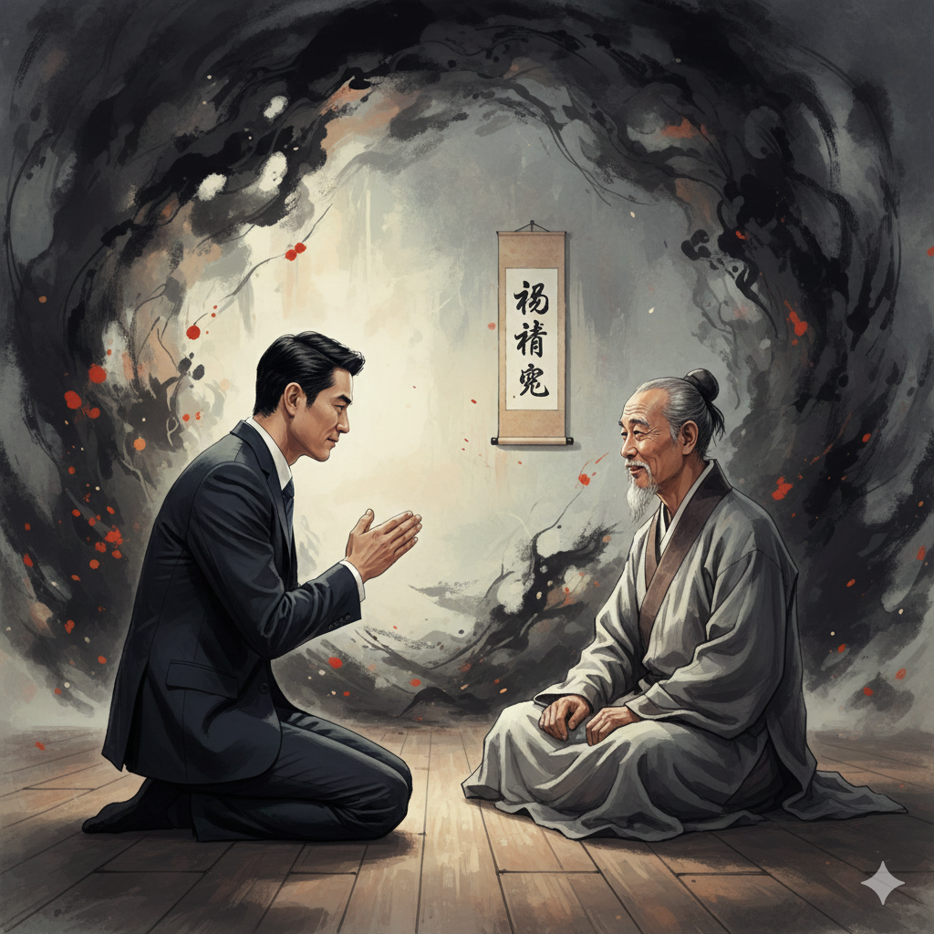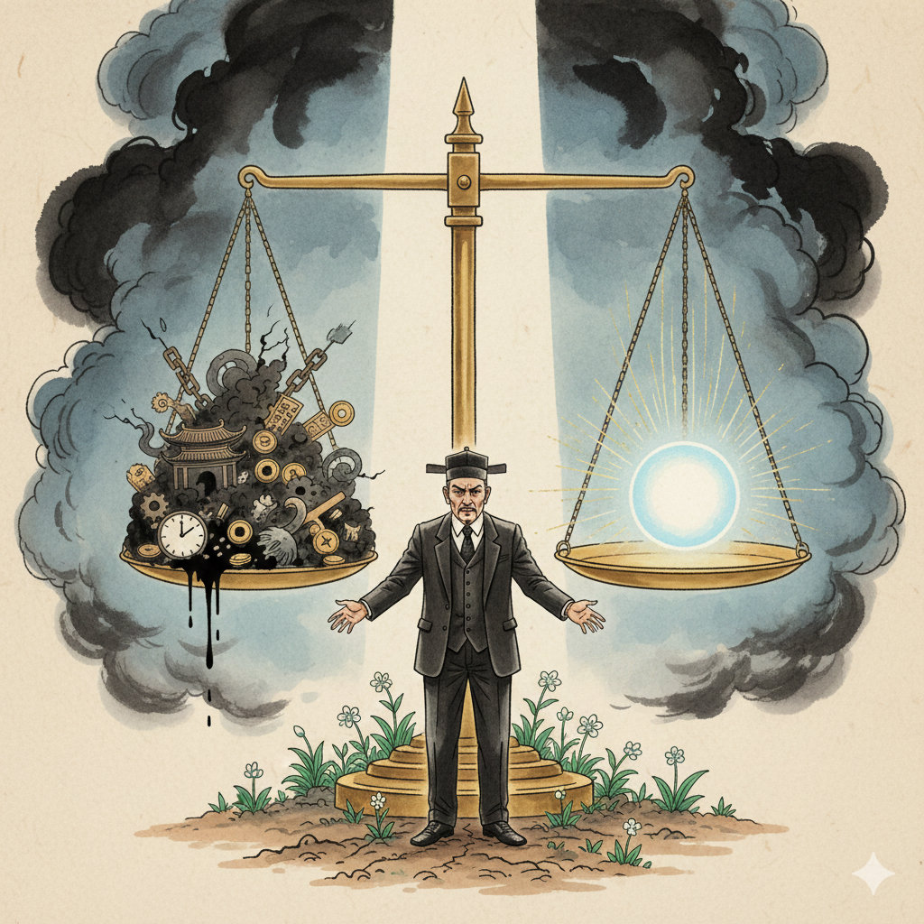 - Image Prompt (English): A complex collage. On one side, shadowy silhouettes of people faintly disappear in a dark, chaotic city alley. On the other, a neatly dressed scholar in a serene Eastern study breaks free from star-shaped shackles, radiating brilliant light. Waves of wise light connect these two scenes.