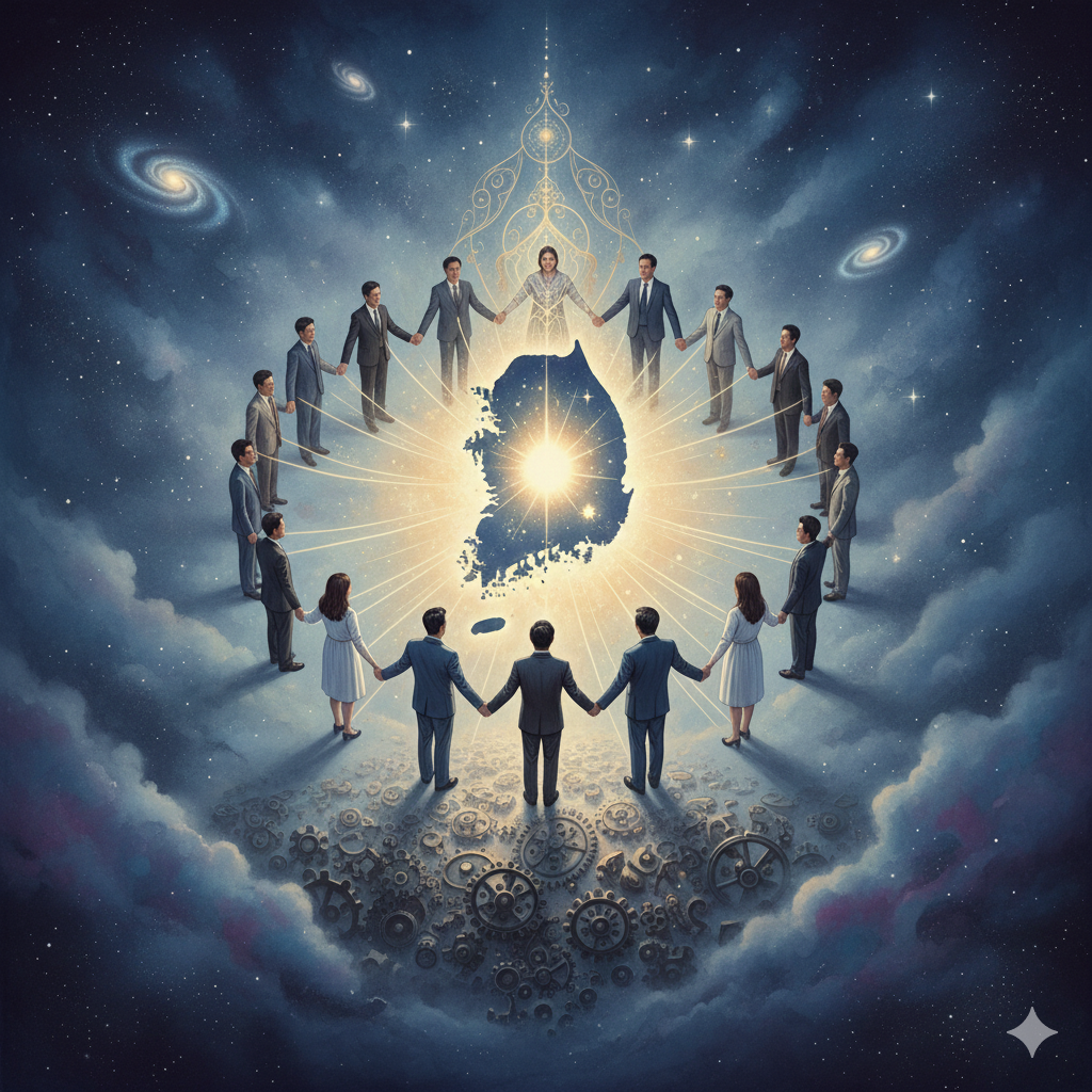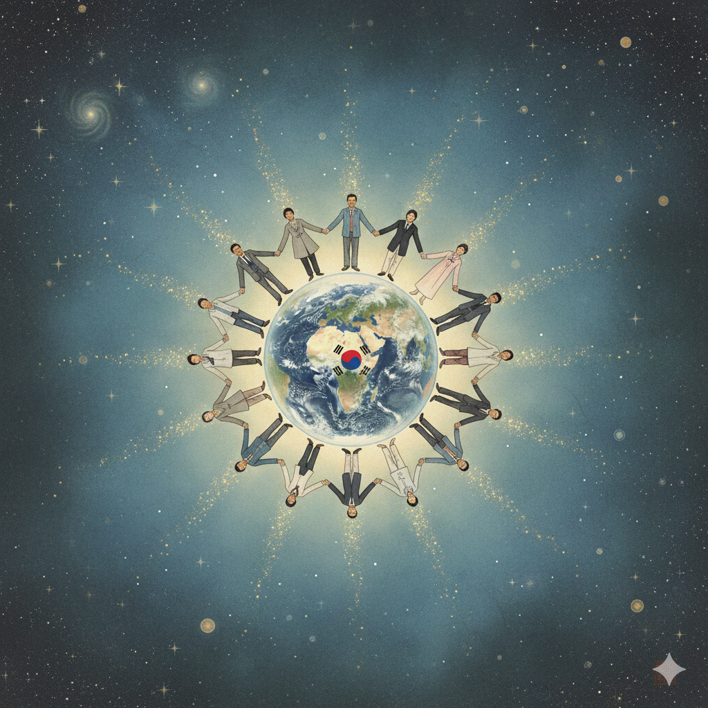 - 이미지 생성 정보 (한국어): 고요한 우주 공간에 빛나는 대한민국 지도가 영적으로 떠 있고, 그 위로 단정하게 옷을 입은 다양한 연령과 직업의 남녀들이 손을 맞잡고 밝게 빛나는 모습을 파노라마로 표현한다. 그들 위로 '홍익인간' 글자가 황금빛으로 빛나며 전 세계를 비추는 동양화풍의 장엄한 콜라주.
