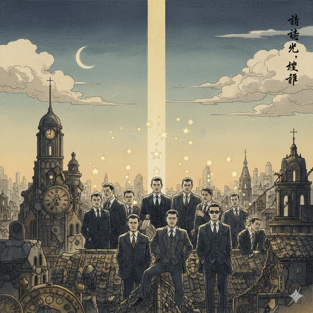 - Image Prompt (English): In a serene Eastern-style study, a wise scholar, neatly dressed, sits in deep meditation with closed eyes. Above his head, a collage reveals broken clockwork gears, shining stars, and intertwined human silhouettes. The background is a magnificent cosmic panorama transitioning from darkness to light, with the scholar's sagacious expression encompassing all these changes.
