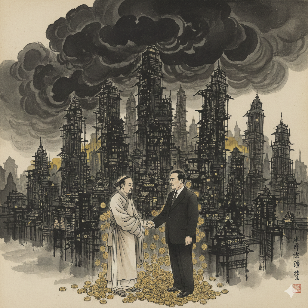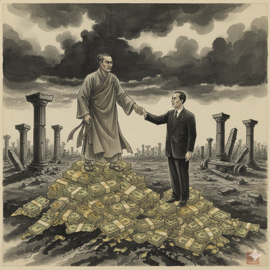 - 이미지 생성 정보 (한국어): 어둡고 낡은 고대 시계 태엽 장치가 배경인 도시 풍경. 그 위로 단정하게 옷을 입은 종교 지도자와 정치인이 비밀스럽게 악수하고, 그들의 뒤로 황금색 돈다발이 흩뿌려지는 동양화풍 콜라주. 탐욕스러운 검은 그림자들이 그들을 에워싼다.