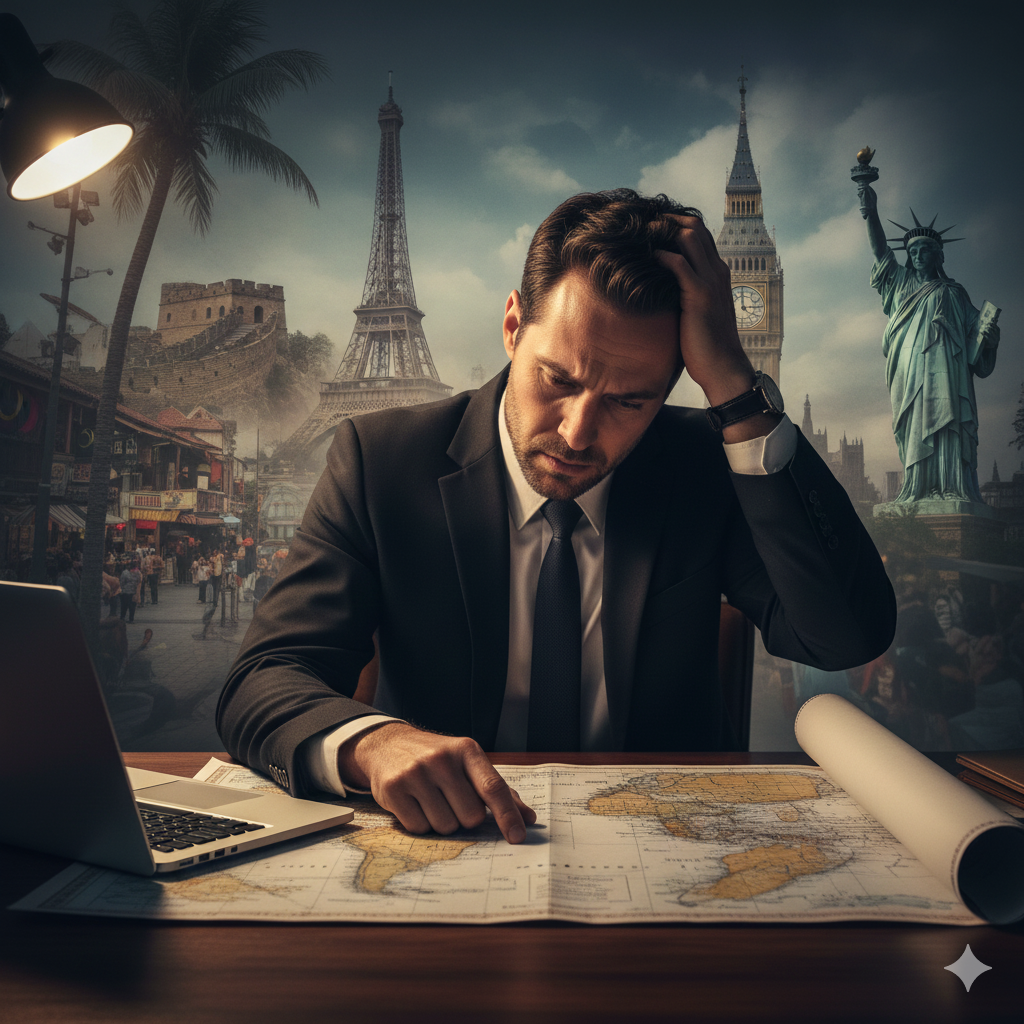 - 이미지 생성 정보 (Korean, ~300자): 단정하게 옷을 입은 30대 후반의 남성이 세계 지도 앞에서 망설이는 모습. 그의 발밑에는 중국과 말레이시아 지도가 흐릿하게 깔려 있고, 시선은 한국 쪽을 향하지만 길은 여러 갈래로 나뉘어 있다. 불안감과 함께 새로운 길을 모색하려는 고뇌가 담겨 있다. Prompt for Google Nano Banana (Korean): 단정하게 옷을 입은 30대 후반 남성이 세계 지도 앞에서 망설인다. 발밑에 중국과 말레이시아 지도가 흐릿하게 깔려있고, 시선은 한국 향하지만 길은 여러 갈래다. 불안감과 새로운 길 모색하려는 고뇌가 담겨 있다. Prompt for Google Nano Banana (English): A neatly dressed man in his late 30s hesitates before a world map. Blurred maps of China and Malaysia lie beneath his feet, his gaze towards Korea, but the path ahead divides into many. He shows anxiety and contemplation for seeking a new direction.