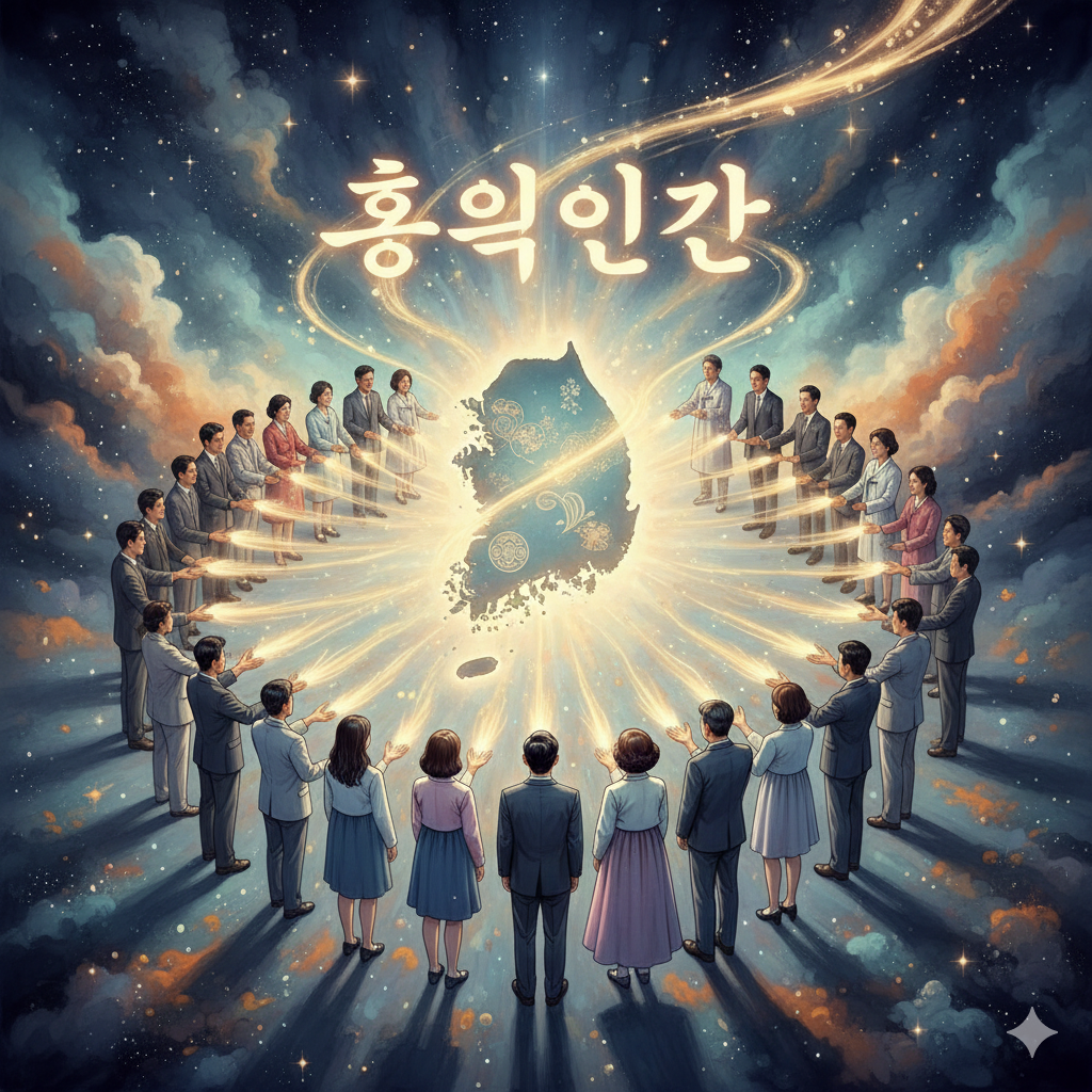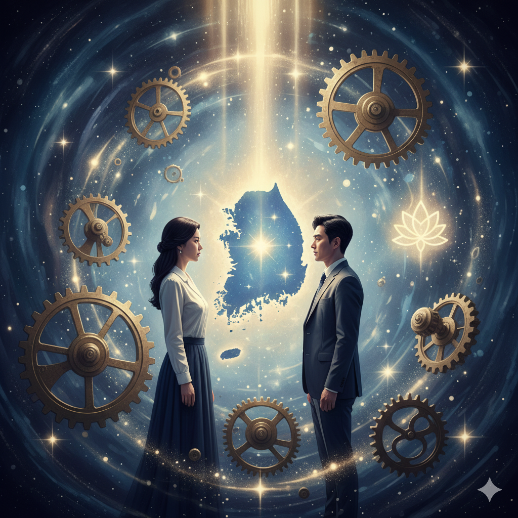 이미지 생성 정보 (Korean, ~300자): 고요하고 영적인 동양화풍의 우주 공간에 빛나는 대한민국 지도가 중심에 떠 있고, 주변에 단정하게 옷을 입은 사람들의 실루엣이 보인다. 이들 각자에게서 뿜어져 나오는 빛이 거대한 시계태엽을 통해 흘러가며, '40대 시험', '홍익인간' 등의 단어들이 우주적 에너지로 형상화된다. 고뇌하던 인물이 깨달음을 얻는 모습이다. Prompt for Google Nano Banana (Korean): 고요하고 영적인 동양화풍 우주 공간에 빛나는 대한민국 지도가 중심에 떠 있다. 단정하게 옷을 입은 사람들의 실루엣이 보이고, 각자에게서 뿜어져 나오는 빛이 거대한 시계태엽 통해 흐른다. '40대 시험', '홍익인간' 단어들이 우주적 에너지로 형상화되고, 고뇌하던 인물이 깨달음을 얻는 모습. Prompt for Google Nano Banana (English): In a serene, spiritual Eastern-style cosmic space, a glowing map of South Korea floats centrally, surrounded by silhouettes of neatly dressed people. Light emanating from each person flows through giant clockwork gears, as words like '40s Test' and 'Hongik Ingan' materialize as cosmic energy. A struggling individual gains enlightenment.
