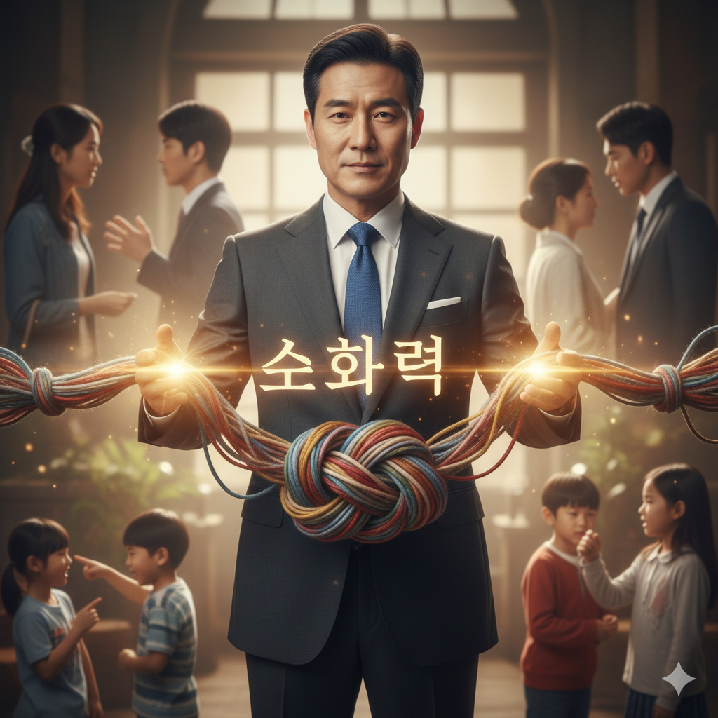 - 이미지 생성 정보 (Korean, ~300자): 동양화풍 콜라주 이미지. 화면 중앙에는 단정하게 옷을 입은 40대 남성이 흔들림 없이 연꽃 위에 서 있고, 그의 주변에는 거대한 톱니바퀴들이 유기적으로 움직인다. 한쪽에는 갈등 상황이 소용돌이치고, 다른 한쪽에는 평화로운 인연, 지혜를 상징하는 빛이 퍼진다. '홍익인간' 글자가 조화롭게 화면에 녹아 있다. Prompt for Google Nano Banana (Korean): 동양화풍 콜라주 이미지. 화면 중앙에는 단정하게 옷을 입은 40대 남성이 흔들림 없이 연꽃 위에 서 있다. 주변에는 거대한 톱니바퀴들이 유기적으로 움직인다. 한쪽은 갈등 상황, 다른 한쪽은 평화로운 인연, 지혜 빛이 퍼진다. '홍익인간' 글자가 조화롭게 녹아 있다. Prompt for Google Nano Banana (English): An Eastern-style collage. At the center, a neatly dressed man in his 40s stands steadily on a lotus. Giant cogwheels move organically around him. One side shows swirling conflict, the other radiating light symbolizing peaceful connections and wisdom. The 'Hongik Ingan' script is harmoniously integrated.
