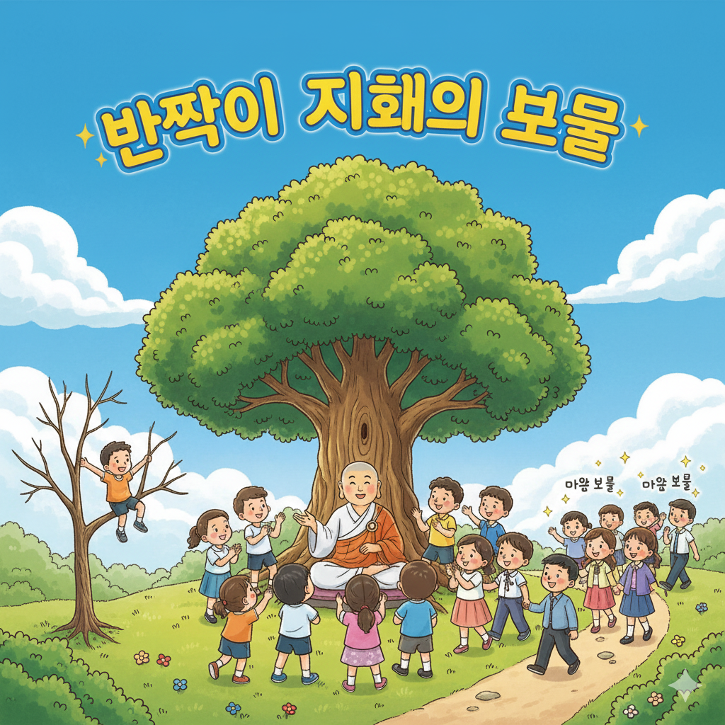 한글 Prompt: 밝고 따뜻한 동화풍 그림으로, 푸른 하늘 아래 신비로운 지혜의 숲이 펼쳐집니다. 숲속 커다란 나무 아래, 단정하게 옷을 입은 자상한 스승님(부처님)이 웃는 얼굴의 아이들(청소년 포함)에게 재미있는 이야기를 들려줍니다. 한쪽에는 뿌리가 없어 힘없이 흔들리는 작은 나무 가지에 아슬아슬하게 매달린 채 고민하는 아이가 대비되고, 다른 한쪽에는 반짝이는 '마음 보물'을 찾아 활짝 웃는 아이들이 단정하게 옷을 입고 함께 손잡고 밝은 길을 걸어갑니다. 제목 "반짝이 지혜의 보물"이 크게 적혀 있습니다.