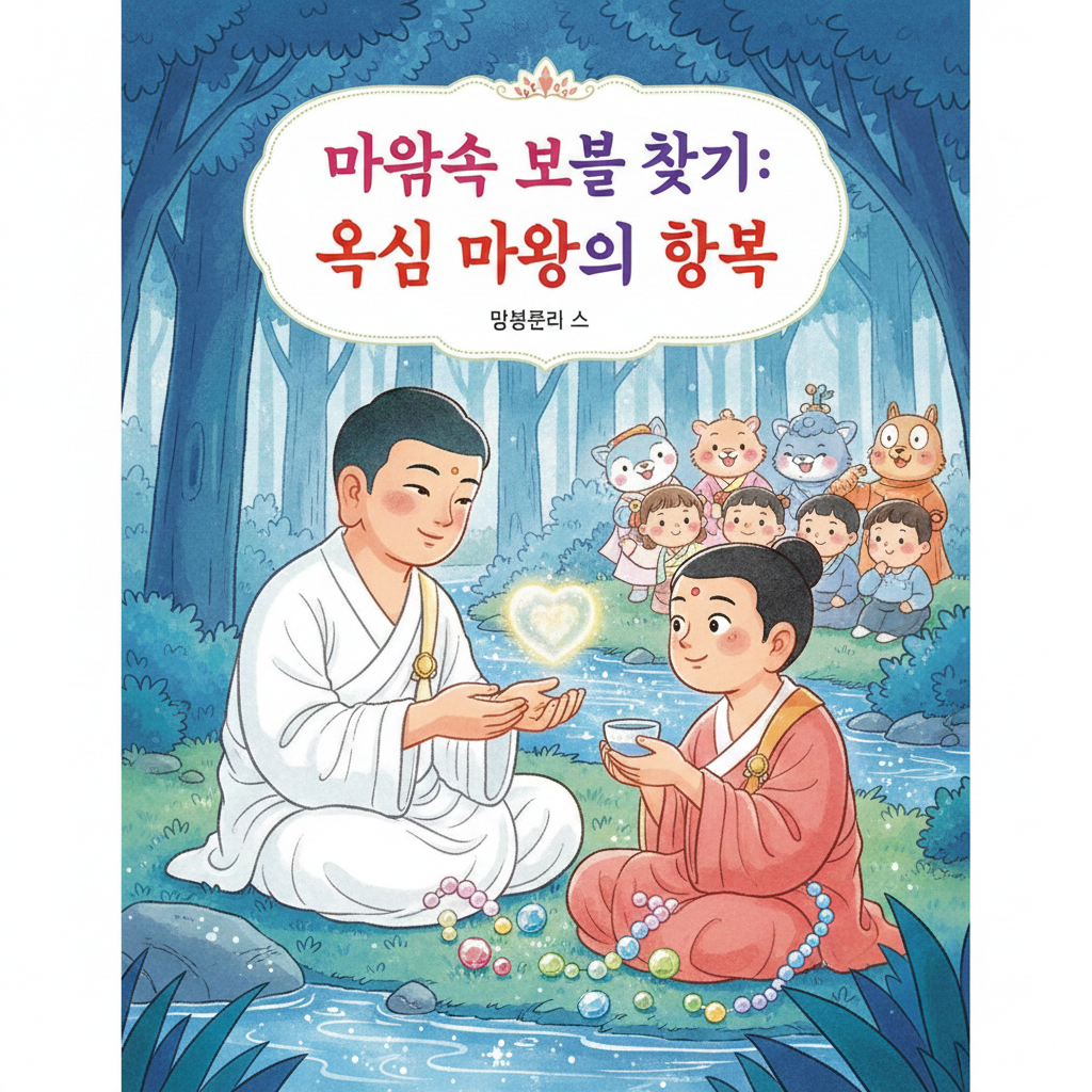 한글: 밝고 환한 동화풍 표지입니다. 푸른 숲속, 반짝이는 시냇물 옆에 지혜로운 도사님(젊은 부처님, 단정한 흰 도포)이 인자하게 웃고 있습니다. 그의 앞에는 더 이상 심술궂지 않고 착하고 예쁜 옷을 입은 '욕심 괴물'(마라)이 작은 컵을 소중히 들고 도사님을 올려다보고 있습니다. 욕심 괴물의 주변으로는 알록달록한 구슬들이 마치 '반짝이는 마음 보물'처럼 흩어져 있고, 도사님과 마왕의 손 사이에는 투명하게 빛나는 하트 모양의 보물이 떠오릅니다. 배경에는 밝게 웃는 동물 친구들과 아이들(단정한 옷차림)이 모여 있으며, 전자책 제목 "마음속 보물 찾기: 욕심 마왕의 항복"이 아기자기한 글씨체로 새겨져 있습니다. 전체적으로 희망적이고 사랑스러운 분위기이며, 모든 인물은 단정하고 예쁜 옷을 입고 있습니다.