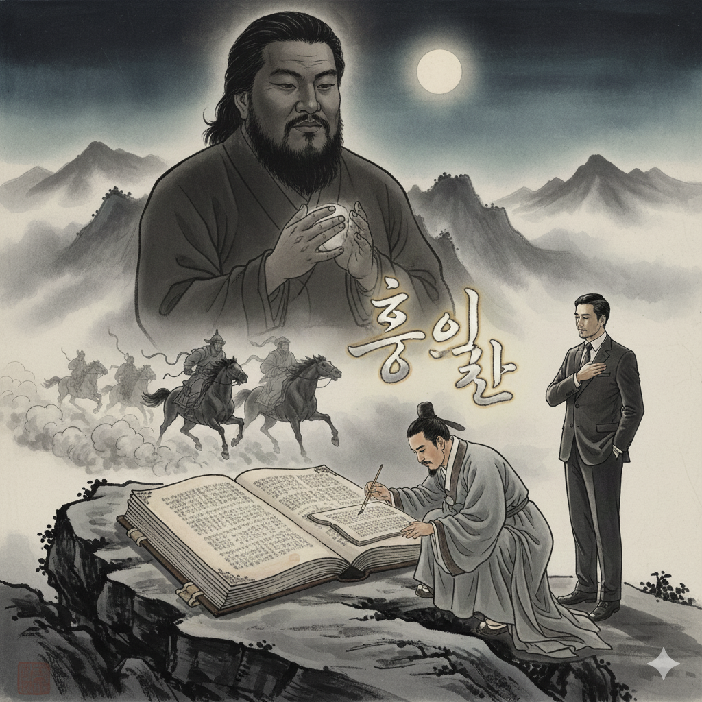 이미지 생성 정보 (한글): 깊은 산속 고즈넉한 동양화풍 서재에서 단정한 한복 차림의 선비가 빛바랜 역사책을 펼쳐보고 있습니다. 책 속에서는 칭기즈 칸의 말발굽과 단군 신화의 환웅, 싯다르타의 명상, 예수의 모습 등 과거 인류 역사의 중요한 장면들이 흑백으로 콜라주되어 피어오릅니다. 선비의 얼굴에는 과거를 고찰하고 새로운 의미를 찾아내려는 지혜로운 표정이 역력합니다.