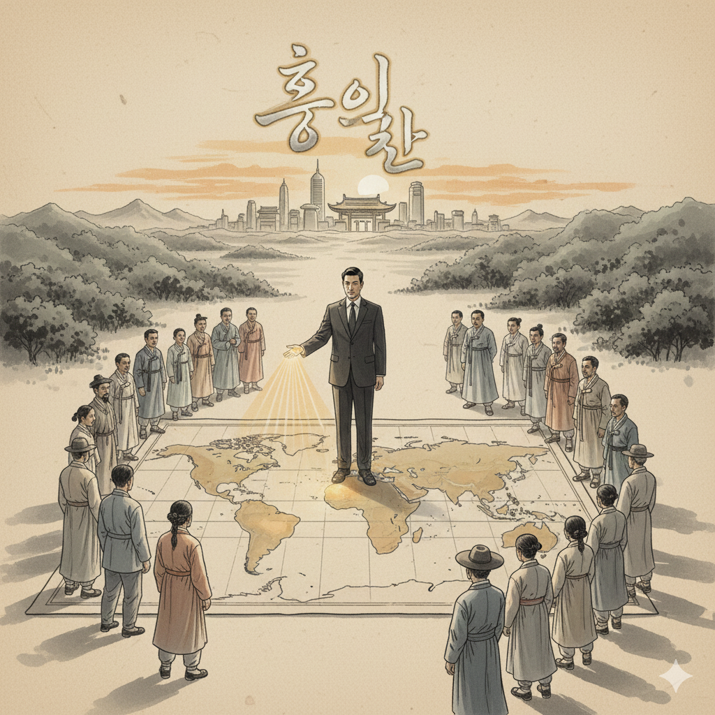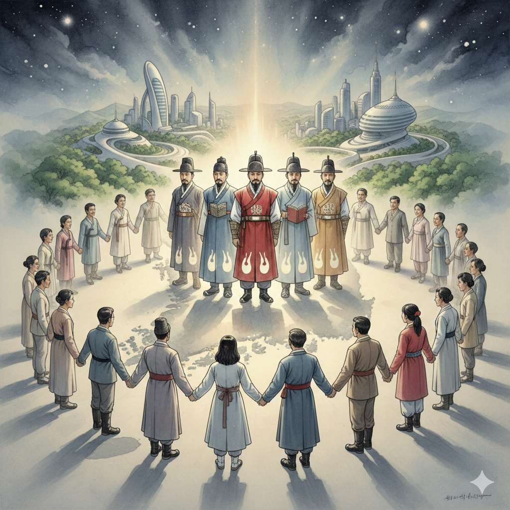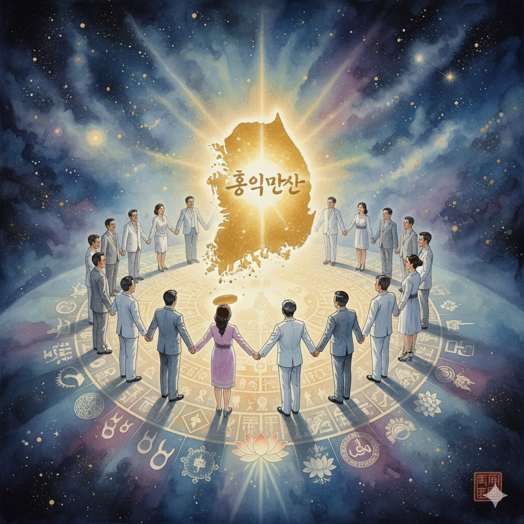 이미지 생성 정보 (English Prompt): In a serene cosmic space, a glowing map of South Korea floats. Above it, diverse individuals in neat, modern clothes form a colossal Hongik Ingan emblem, symbolizing human peace. Rings of light representing wisdom rotate around them, creating an Eastern painting-style panoramic collage that emanates peaceful, wise energy, contrasting with Genghis Khan's past valor.