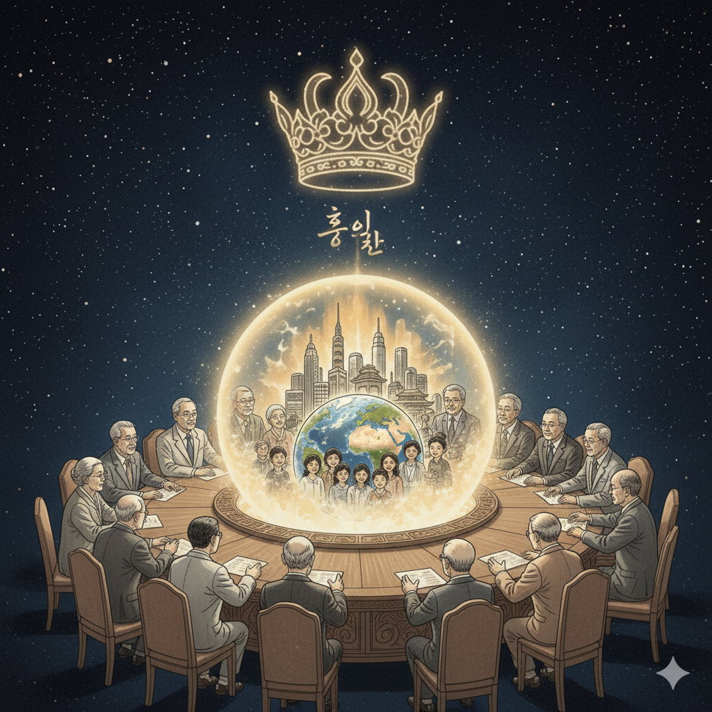이미지 생성 정보 (한글): 고요하고 영적인 우주 공간에서, 거대한 대한민국 지도가 인류의 심장처럼 고동치며 빛나고 있습니다. 지도 위에는 단정하고 현대적인 옷을 입은 수많은 사람들이 각자의 자리에서 밝은 에너지(지혜)를 발산하며 하늘로 뻗어나가는 거대한 '생명의 나무'를 만들어냅니다. 나무의 뿌리에는 칭기즈 칸의 말발굽과 싯다르타의 명상, 예수의 사랑 등 인류 역사의 지혜로운 유산들이 빛나는 보석처럼 박혀있고, 나무의 꼭대기에는 '홍익인간' 글자가 황금빛으로 찬란하게 빛나는 동양화풍의 감성적인 콜라주 이미지입니다.