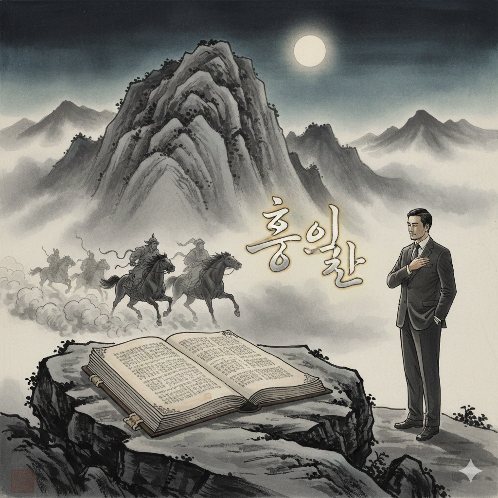 이미지 생성 정보 (English Prompt): In a tranquil Eastern-style study within deep mountains, a scholar in neat Hanbok reviews a faded history book. Black and white collages of Genghis Khan's horse hooves, Hwanung from Dangun myth, Siddhartha meditating, and Jesus's image rise from the book, depicting pivotal moments in human history. The scholar's face shows wise contemplation, seeking new meaning from the past.