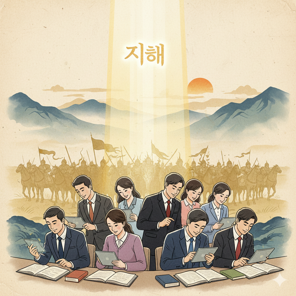 이미지 생성 정보 (English Prompt): In a serene Eastern-style classroom, a neatly dressed lecturer stands before a glowing whiteboard. Emphasized sentences, written in beautiful golden calligraphy, shine on the board. The lecturer gestures passionately to the audience, who, also neatly dressed, nod in serious attention. Outside the window, a hopeful dawn breaks, completing the image.