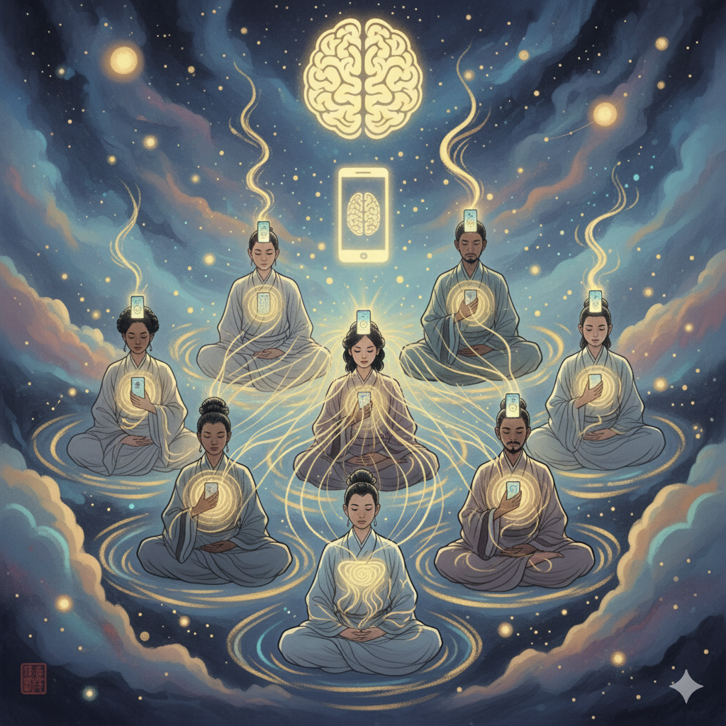 [English] In a serene, mystical Eastern painting style cosmic space, neatly dressed people of various ages sit in a circle, meditating. In their center, a luminous fountain of wisdom gushes, its blue waters flowing through complex brain-like forms and being absorbed into golden souls. Smartphones and ancient books are harmoniously placed around them. Everyone wears peaceful, hopeful expressions, gaining deep enlightenment. This image symbolically represents the wisdom and lessons derived from the lecture.