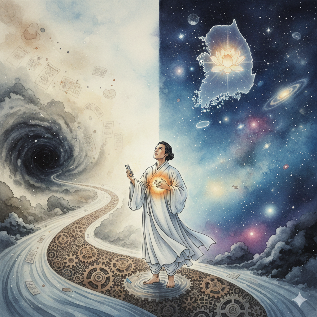 [English] A serene, dreamy Eastern painting style panoramic collage. On one side, old clockwork gears and fading memory fragments flow like a river; on the other, an endlessly unfolding luminous universe. A neatly dressed person wades in the river, holding a smartphone in one hand and glowing 'naegong' over their heart, gazing up at the sky. Above, a lotus of 'wisdom' blooms over a shining map of South Korea, poetically expressing humanity's spiritual evolution.