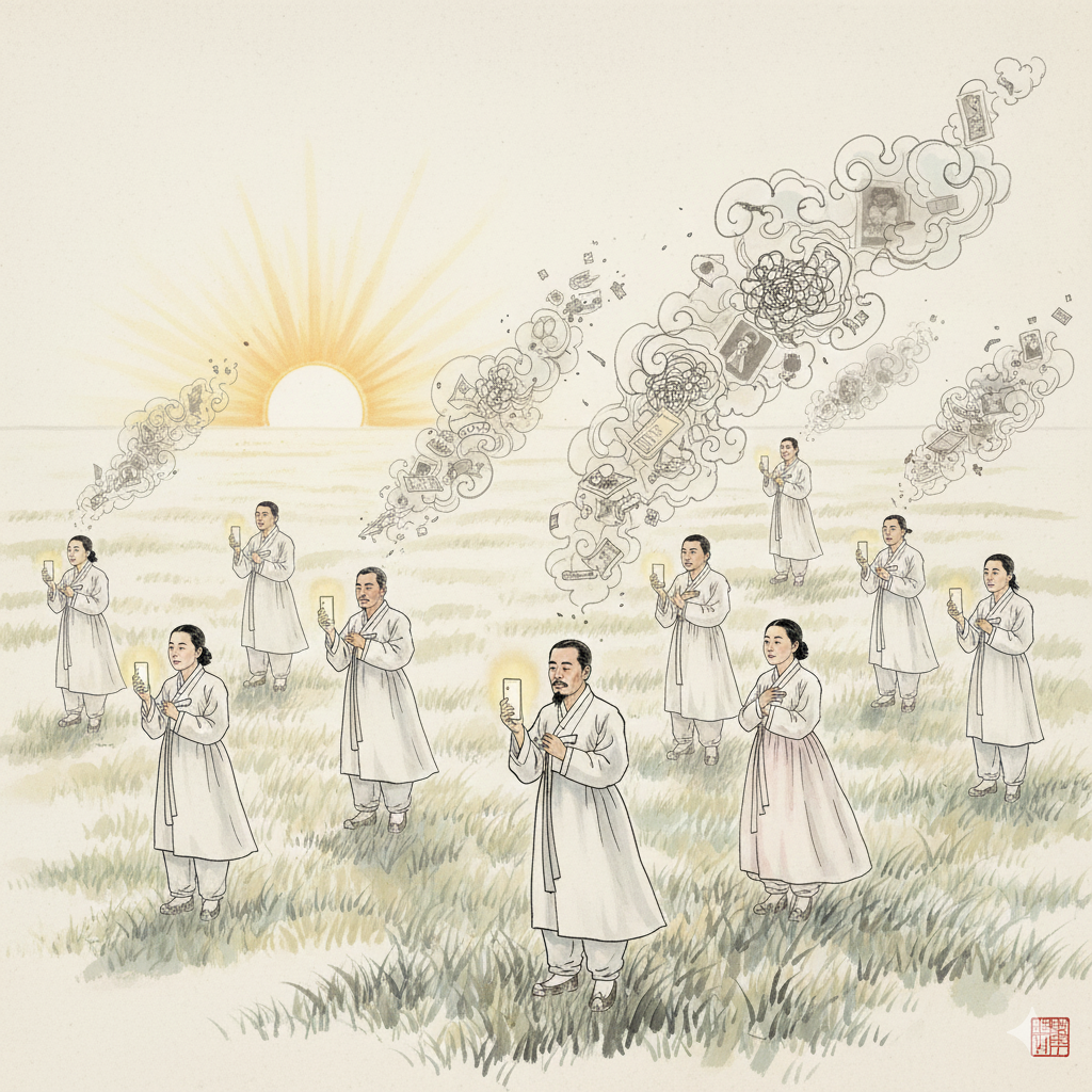 [English] A colossal lotus blooms, emitting brilliant light, on a serene, peaceful Eastern painting style pond. Neatly dressed men and women of various ages stand around the lotus, meditating with closed eyes, their faces peaceful and hopeful. Though holding smartphones and tablets, their gaze is directed inward. The light of wisdom from the lotus spiritually permeates their 'souls' as golden 'naegong,' conveying positive energy.