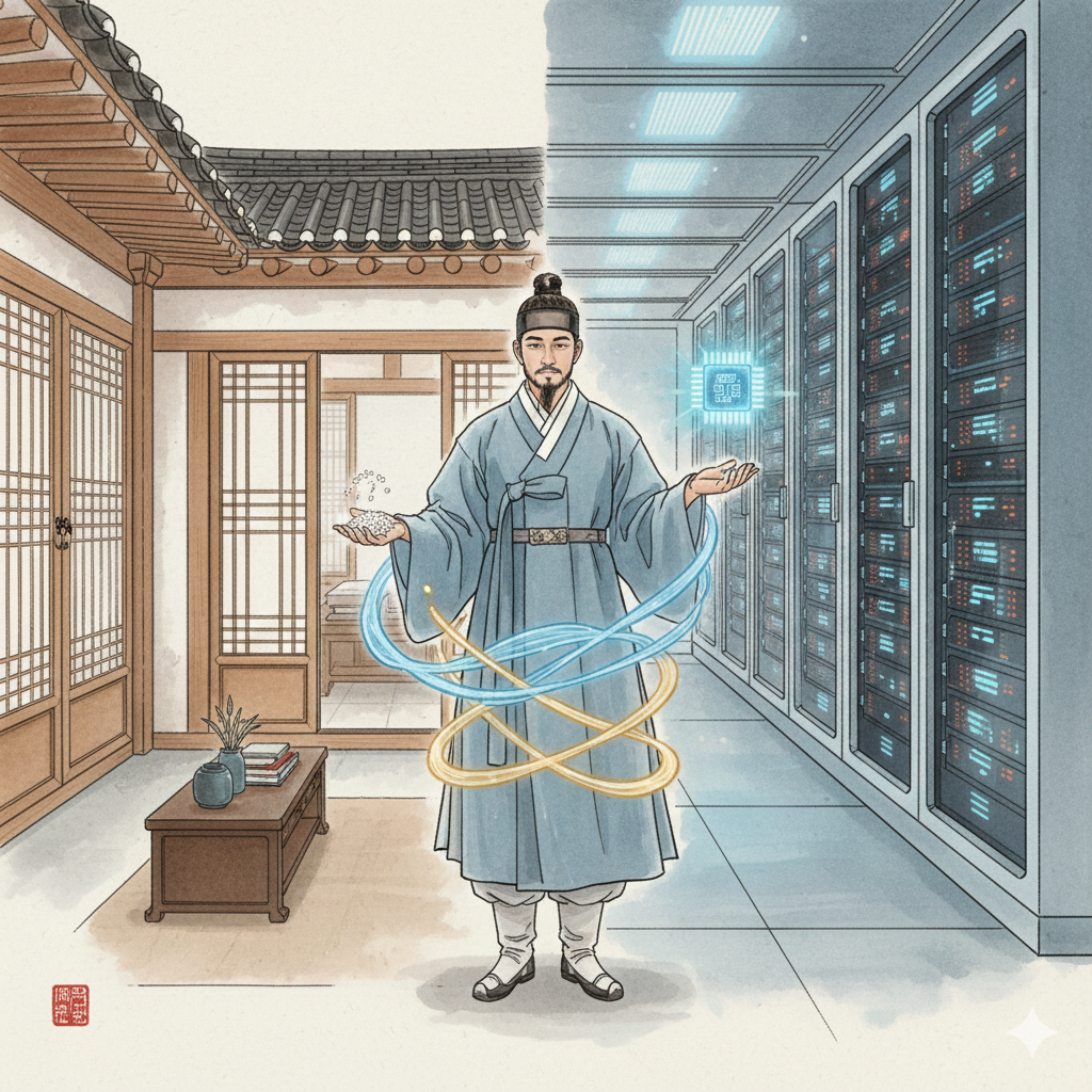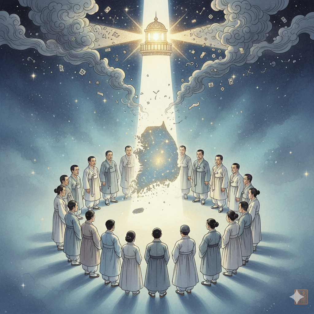 [한국어] 고요하고 몽환적인 동양화풍의 파노라마 콜라주입니다. 한쪽에는 낡은 시계태엽과 흐릿한 기억의 파편들이 강물처럼 흐르고, 그 반대편에는 무한히 펼쳐진 영롱한 우주가 보입니다. 단정하게 옷을 입은 한 인물이 강물에 발을 담그고 한 손으로는 스마트폰을, 다른 손으로는 심장 위에 빛나는 '내공'을 움켜쥔 채 하늘을 올려다봅니다. 그의 시선 끝에는 빛나는 대한민국 지도 위로 '지혜'의 연꽃이 피어나며, 인류의 영적 진화를 시적으로 표현합니다.