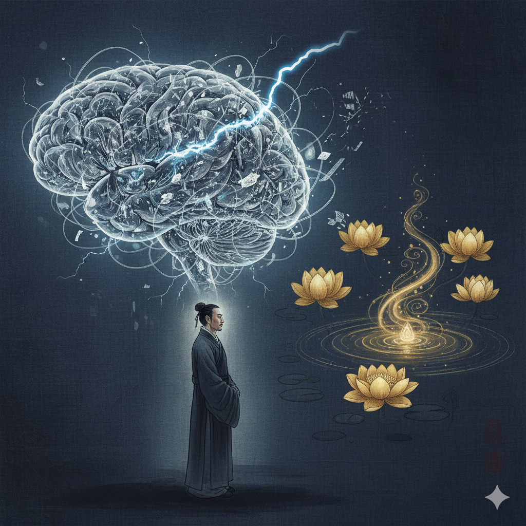 [한국어] 어둡고 혼란스러운 도시의 뒷골목을 배경으로, 단정하게 옷을 입은 한 중년 남성이 두 손으로 머리를 감싸 쥐고 깊은 고뇌에 잠겨 있습니다. 그의 머리 위로는 엉켜버린 실타래 같은 복잡한 정보들이 어지럽게 떠다니며, '쓸모없는 생각', '과부하된 뇌' 같은 단어들이 희미하게 보입니다. 주변에는 무심하게 놓인 스마트폰이 어두운 빛을 발하고 있으며, 남자의 그림자는 더욱 길고 깊게 드리워져 답답함과 어려움을 동양화풍의 명암 대비로 강조합니다.