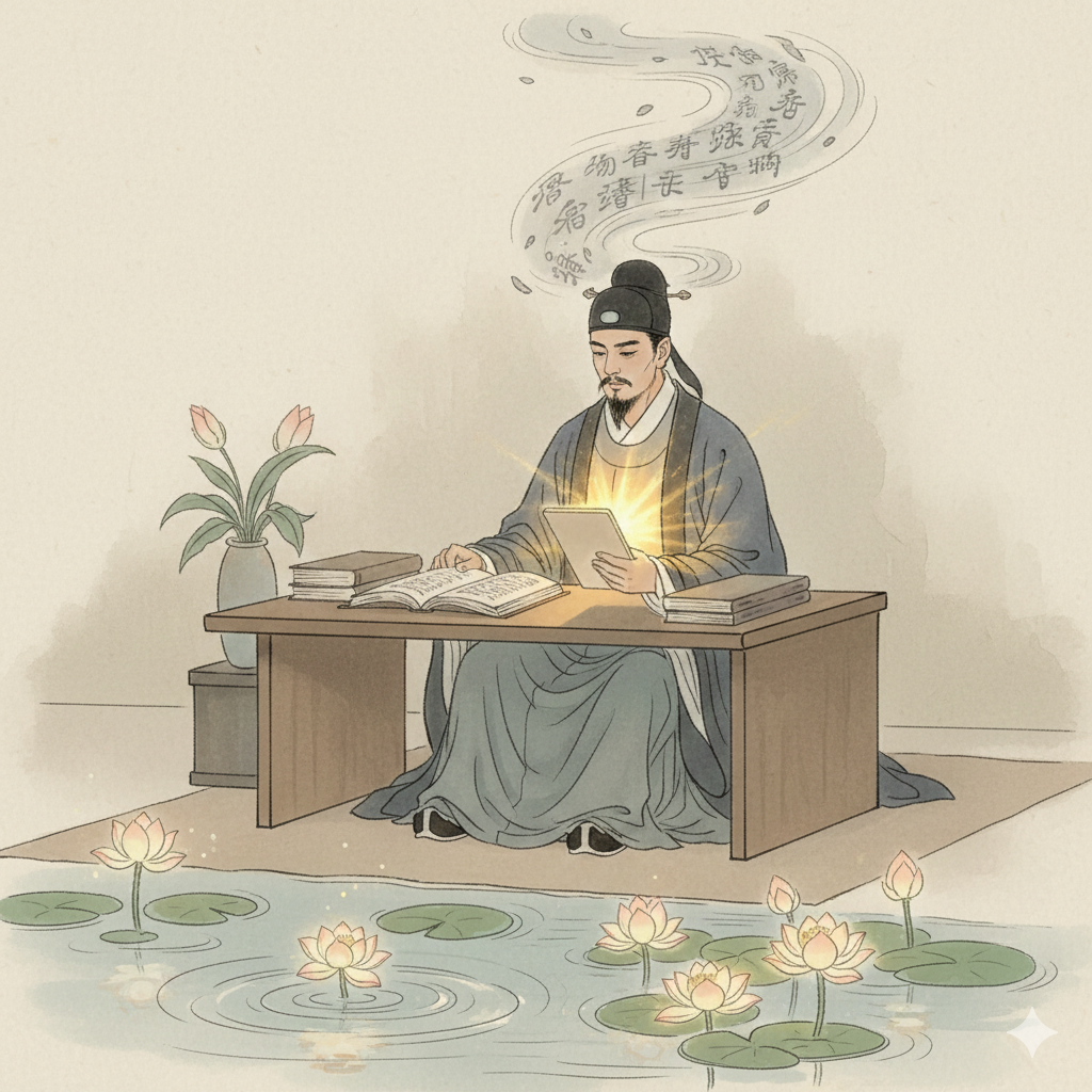 [한국어] 고요하고 평화로운 동양화풍의 연못 위에 거대한 연꽃이 환한 빛을 내뿜으며 피어납니다. 단정하게 옷을 입은 다양한 연령대의 남녀가 연꽃 주위에 서서 눈을 감고 명상하며, 그들의 표정은 평화롭고 희망에 차 있습니다. 그들 손에는 스마트폰과 태블릿이 있지만, 시선은 내면의 빛을 향하고 있습니다. 연꽃에서 뿜어져 나오는 지혜의 빛은 그들의 가슴 속 '영혼'에 황금빛 '내공'으로 스며드는 모습을 영적으로, 긍정적인 에너지로 표현합니다.