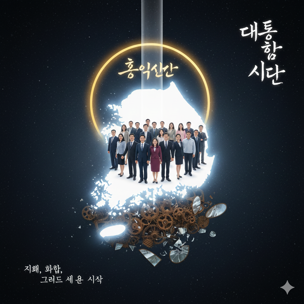- 한글: 고요하고 영적인 동양화풍의 우주 공간을 배경으로, 힘차게 빛나는 대한민국 지도가 중심에 떠 있습니다. 지도 위에는 단정하고 현대적인 옷을 입은 다양한 국적과 인종의 사람들이 서로 손을 맞잡고 서 있으며, 이들의 위로 '인류를 이롭게 하라'는 뜻의 '홍익인간'이라는 황금빛 글자가 오라처럼 감싸고 있습니다. 한편, 지도의 아래에는 복잡하게 얽힌 낡은 시계 태엽(과거의 혼란)과 깨진 거울 조각(낡은 상식)들이 어렴풋이 보이며, 이 모든 것을 맑고 투명한 지혜의 빛이 감싸 안고 있습니다. 책의 제목과 부제가 동양화 붓글씨 형태로 은은하게 빛나며 통합된 비전을 전달합니다.