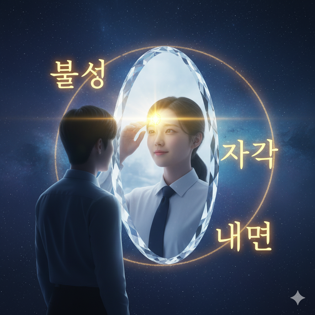 English Image Prompt: A serene, spiritual Eastern-style cosmic space unfolds mysteriously. A massive, transparent crystal mirror floats within it, vividly reflecting a neatly dressed young person's (gender-neutral) forehead from which a brilliant golden 'Vajra Gem' radiates. Outside the mirror, a blurred silhouette of the youth, previously agonizing with hand on forehead, is visible. Korean keywords like 'Buddha-nature,' 'Self-realization,' and 'Inner Self' subtly glow golden around it. The image conveys a moment of self-discovery in a contemplative, hopeful atmosphere.