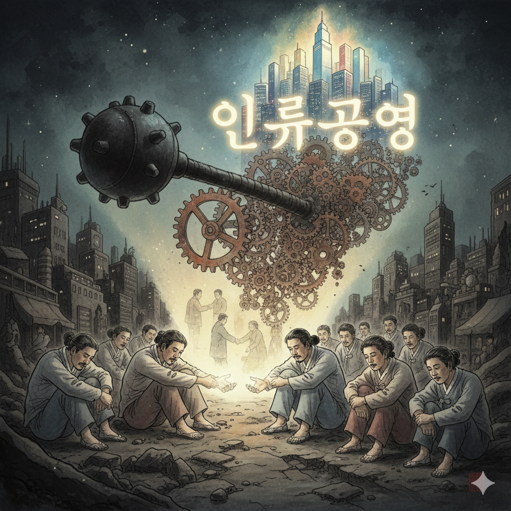 - English: In a tranquil and wise East Asian-style study, a neatly dressed modern individual meditates. Golden Korean keywords such as 'reflection,' 'wisdom,' 'coexistence,' and 'humanitarian prosperity' illuminate around him. Above his head, the fading shadows of a 'merchant's' abacus and an 'entrepreneur's' gears vanish, revealing a transparent vision of an ideal future society where a 'social entrepreneur' sows seeds and reaps fruits, representing the process of introspecting the past and gaining wisdom for the future. (Approx. 300 characters)