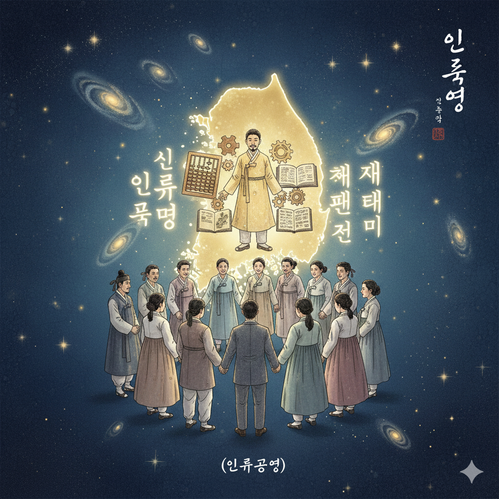 - 한글: 고요하고 영적인 동양화풍의 우주 공간을 배경으로, 빛나는 대한민국 지도가 중심에 떠 있습니다. 지도의 상공에는 '장사치', '기업인'을 상징하는 낡은 주판과 톱니바퀴들이 혼란스럽게 얽혀 있지만, 이들을 뚫고 솟아오르는 '사업가'의 푸른 씨앗이 희망차게 자라고 있습니다. 그 아래로는 단정하게 옷을 입은 다양한 연령과 국적의 남녀들이 손을 잡고 명상하며, 이마에서 뿜어져 나오는 황금빛 지혜의 빛으로 지구본 위에 '신 패러다임'과 '인류공영'이라는 한글이 밝게 빛나는 콜라주 이미지. (약 300자)
