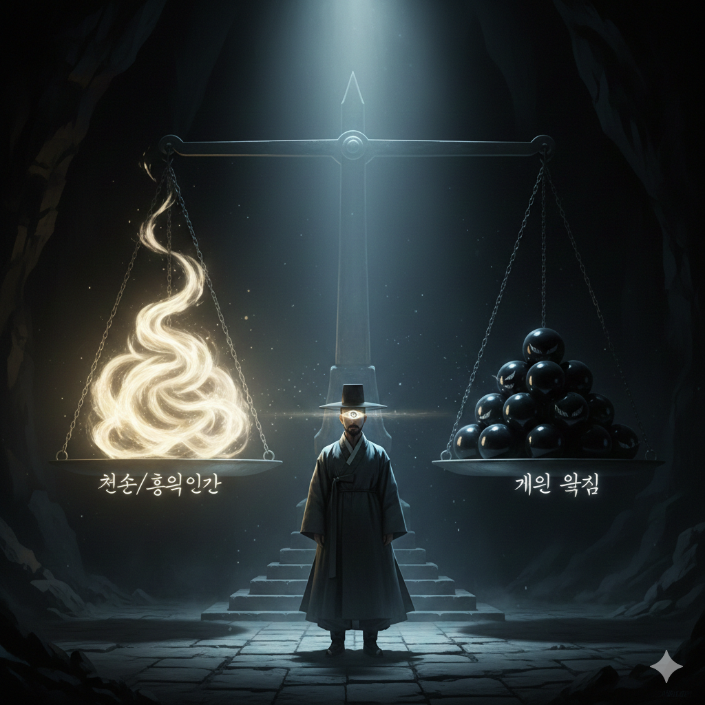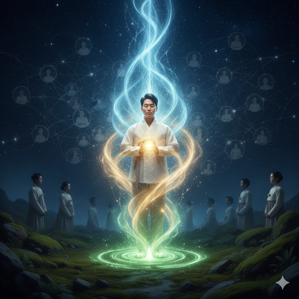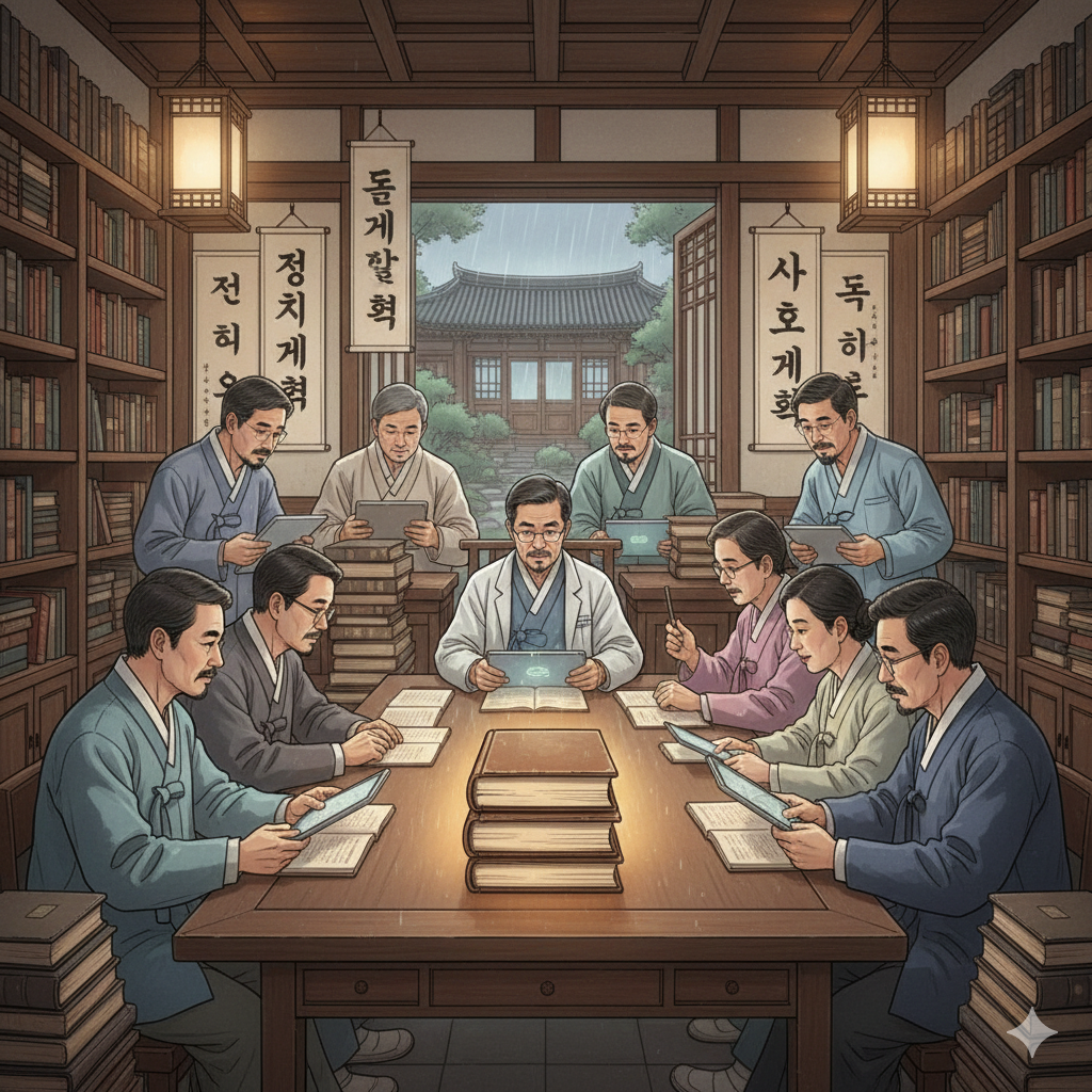 - 이미지 생성 정보 (Google Nano Banana 스타일): 한글: 고즈넉한 한옥 서재에서 단정하게 옷을 입은 한 선비가 고서와 현대 태블릿을 번갈아 보며 깊이 사색하고 있다. 그의 머리 위에서는 지혜와 내공을 상징하는 밝은 빛의 기운이 솟아나 우주와 연결되는 모습이 표현된다. English: In a tranquil Hanok study, a neatly dressed scholar, alternating between ancient texts and a modern tablet, is in deep contemplation. Above their head, bright energy, symbolizing wisdom and inner strength, emanates and connects with the cosmos.