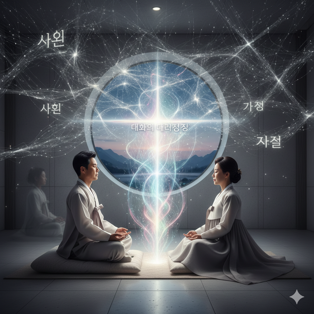 - 이미지 생성 정보 (Google Nano Banana 스타일): 한글: 넓고 따뜻한 공간에서 단정하게 옷을 입은 다양한 연령대의 남녀들이 원형 테이블에 둘러앉아 심도 있는 대화를 나누고 있다. 그들 위로 '사회'와 '가정'을 상징하는 밝은 빛의 상징들이 떠오르며, 한 여성이 아이에게 온화한 미소를 짓고 있다. 모든 인물들이 서로 존중하며 배려하는 모습. English: In a spacious, warm setting, neatly dressed men and women of various ages sit around a circular table, engaged in deep conversation. Above them, bright symbols representing 'society' and 'family' float. One woman offers a gentle smile to a child, emphasizing mutual respect and consideration among all figures.