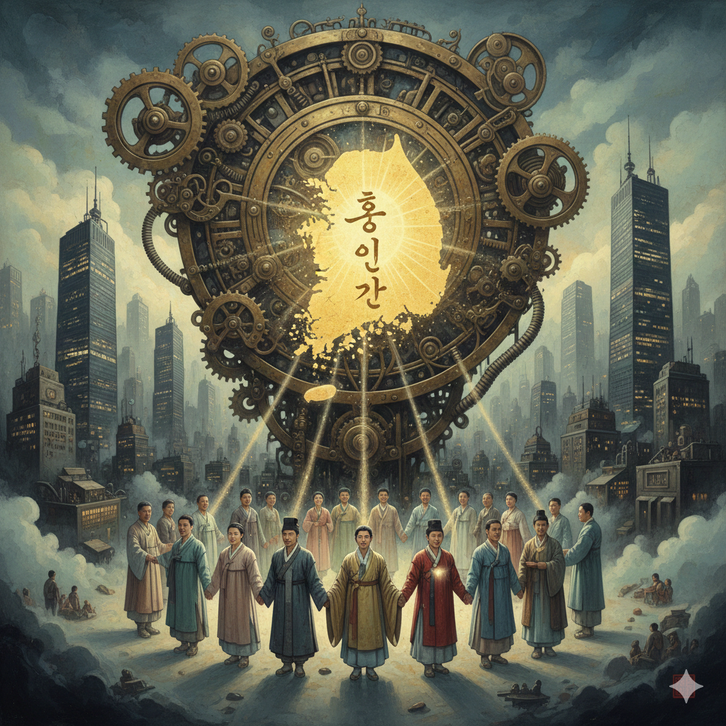 - 이미지 생성 정보 (Google Nano Banana 스타일): 한글: 어둡고 혼란스러운 도시 배경에 거대한 낡은 시계 태엽 장치가 복잡하게 얽혀 있고, 그 위로 단정하게 옷을 입은 사람들이 녹슨 부품을 교체하고 기름때를 닦아내며 기계를 수리하는 모습. 그들 위로는 '정비 중'이라는 팻말이 빛나고, 점차 어둠이 걷히고 희망찬 도시의 실루엣이 드러난다. English: Against a dark, chaotic city background, intricate old clockwork gears are intertwined. Neatly dressed people are seen repairing the machine, replacing rusty parts and cleaning grime. Above them, a 'Under Maintenance' sign glows, and gradually, the silhouette of a hopeful city emerges from the darkness.
