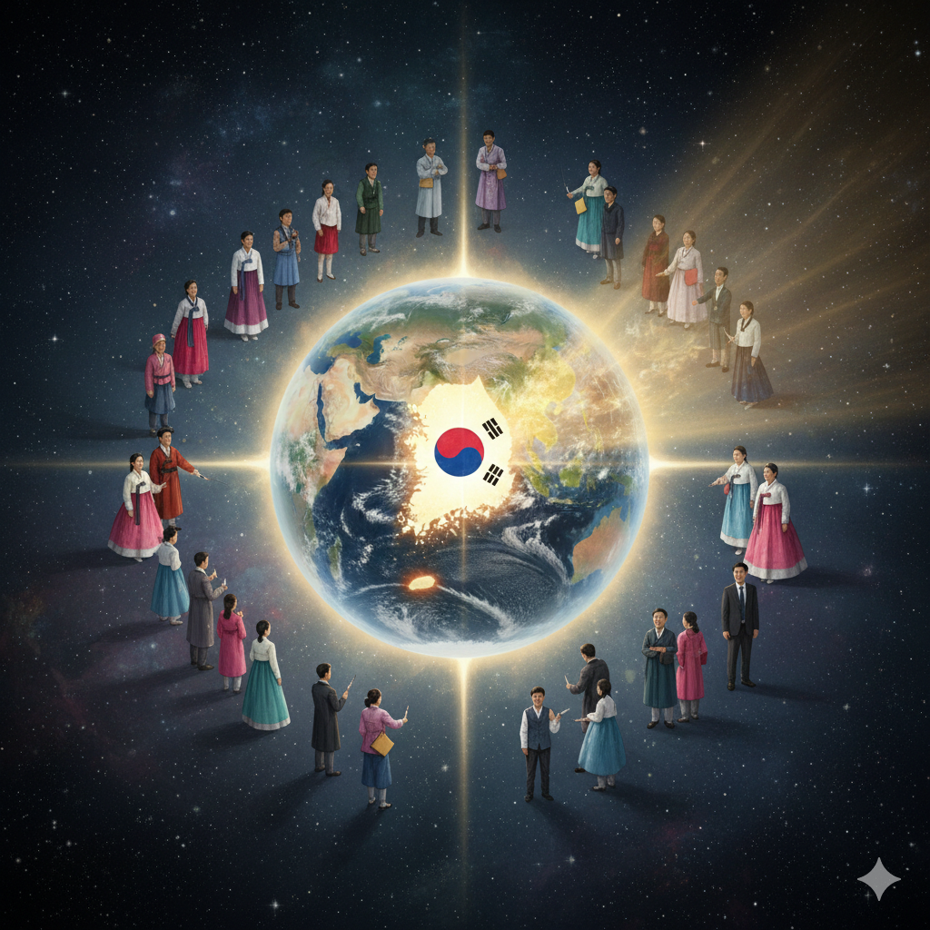 - 이미지 생성 정보 (Google Nano Banana 스타일): 한글: 고요한 우주 배경에 힘차게 빛나는 대한민국 지도가 떠오르고, 그 주위로 단정하게 옷을 입은 다양한 인종과 연령대의 사람들이 손을 맞잡고 '희망'과 '조화'를 상징하는 밝은 빛의 에너지를 지구 전체로 뻗어나가게 하는 모습. 모두의 얼굴에 희망찬 미소가 가득하다. English: Against a serene cosmic background, a brilliantly luminous map of South Korea floats. Around it, neatly dressed people of various ethnicities and ages hold hands, emitting bright energy symbolizing 'hope' and 'harmony' that spreads across the entire Earth. All faces are filled with hopeful smiles.