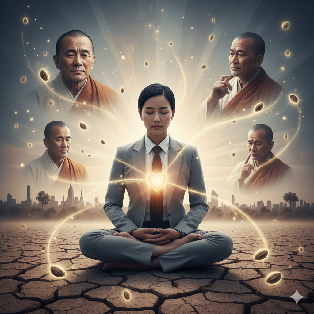 English Image Information (approx. 300 words): A serene, spiritual Eastern painting collage. At its core, a neatly dressed modern individual is deep in contemplation. A warm light emanates from their chest, symbolizing the "messenger from the belly" – the deepest inner voice. Around them, elements of a cracked landscape and a parched cityscape (modern scarcity), a compassionate yet pensive leader, and the past and present lives of Ananda and the Brahmin scholar blend softly. Seeds of wisdom glow, linking past, present, and future, conveying a Nanobanana-style spiritual message.