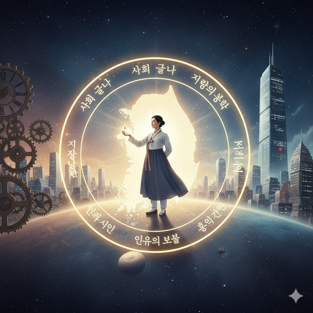 - English: In a tranquil and spiritual East Asian painting-style cosmic space, a luminous map of South Korea floats. On it, a neatly dressed young person stands confidently, holding a seed of wisdom in their hand and gazing into the distant future. Around them, Korean keywords like 'Social Learning,' 'Quality Growth,' 'Law of Nature,' 'Societal Member,' 'Treasure of Humanity,' and 'Hongik Ingan' form a golden aura. The background features a harmoniously collaged old clockwork gear and a gleaming futuristic city, rendered as a fantastic Google Nano Banana style collage.
