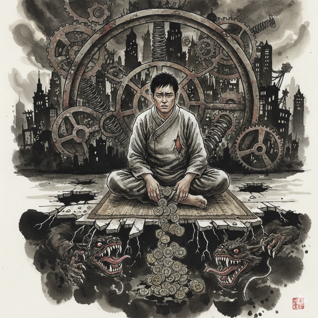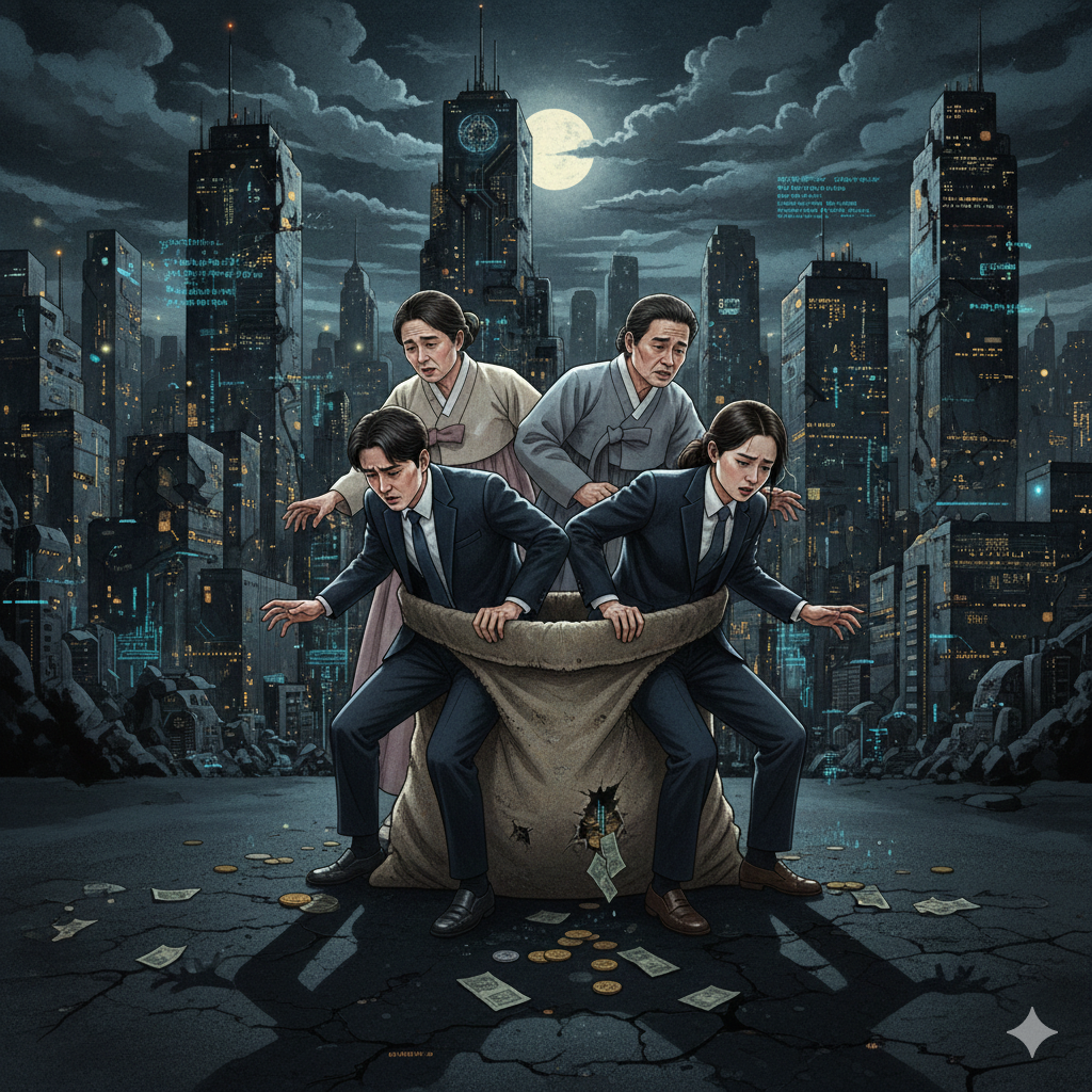 - 한글: 어둡고 혼란스러운 도시의 뒷골목에 낡은 시계 태엽이 복잡하게 얽혀 있다. 그 아래, 단정하게 옷을 입은 성인 남녀가 거대한 캥거루 주머니 안에 몸을 웅크리고 불안한 표정을 짓고 있다. 그들이 움켜쥔 돈다발이 연기처럼 흩어지거나, 주변의 맹수(사기, 사고를 상징)에게 빼앗기는 장면이 드라마틱하게 표현된 구글 나노 바나나 스타일의 동양화풍 콜라주.
