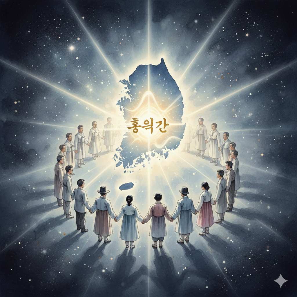 - 한글: 고요하고 영적인 동양화풍의 우주 공간에 빛나는 대한민국 지도가 중심에 떠 있다. 지도 위에는 단정하게 옷을 입은 다양한 인종과 국적의 젊은이들이 손을 맞잡고 서 있으며, 그들의 심장에서 빛나는 황금빛 에너지(질량, 지혜)가 뿜어져 나와 지구 전체를 감싸 안는다. '인류의 보물', '빛나는 삶'이라는 한글 메시지가 별처럼 빛나는 구글 나노 바나나 스타일의 환상적인 콜라주.