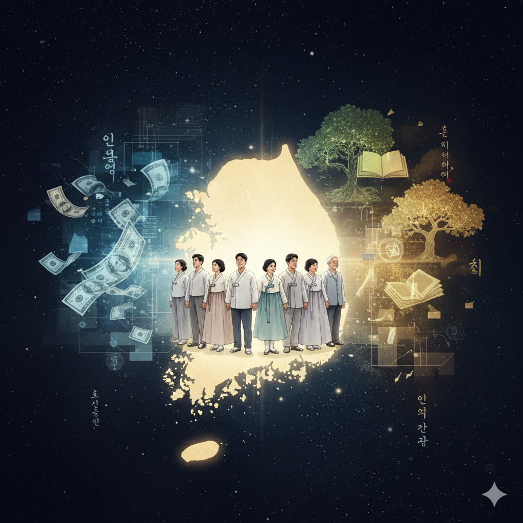 - 한글: 고요한 우주 공간에 빛나는 대한민국 지도가 떠 있고, 그 위에 단정하게 옷을 입은 젊은 남녀가 지혜의 나무 아래에서 사색하고 있다. 나무의 가지에는 '질량 성장', '자립', '상생'이라는 한글 단어가 황금빛으로 피어나고, 뿌리는 깊이 땅속으로 뻗어 부모 세대의 희생을 상징한다. 젊은이들의 손에는 씨앗(미래)이 들려 있으며, 그들의 눈빛에는 깨달음과 책임감이 가득한 구글 나노 바나나 스타일의 동양화풍 콜라주.