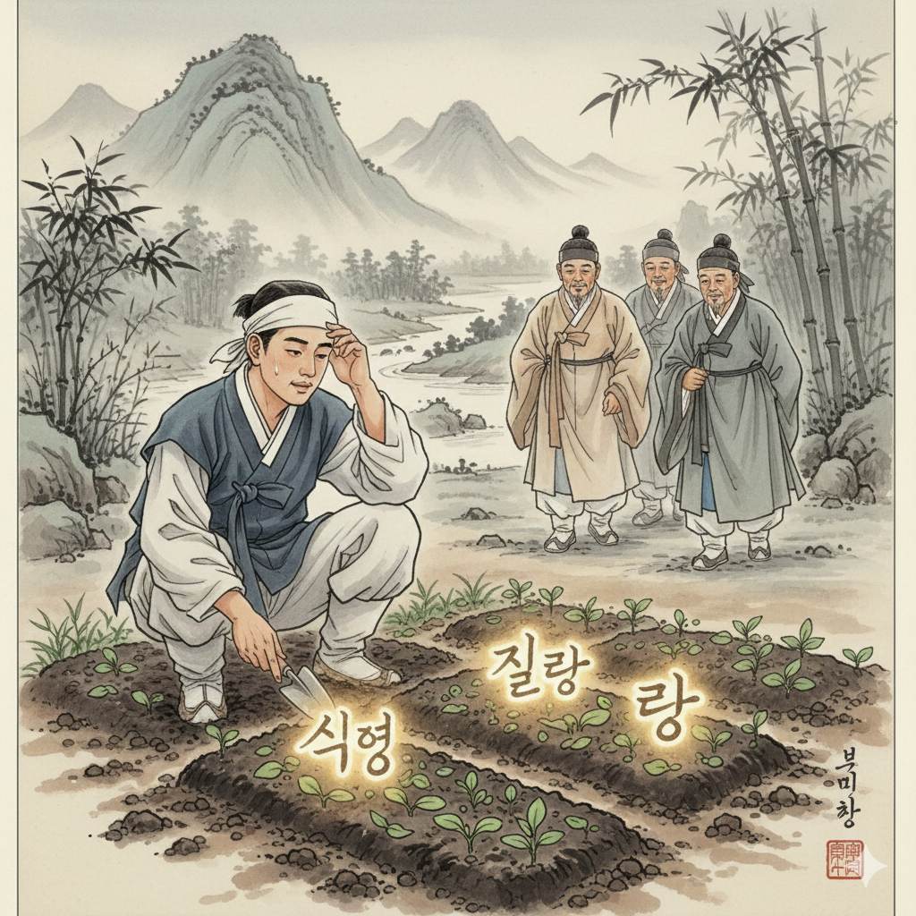 - English: In a bright and hopeful East Asian painting-style wilderness, neatly dressed young people sow small seeds in their respective places. Golden Korean messages of 'Hope,' 'Growth,' and 'Self-Reliance' descend with warm sunlight upon them. A shining map of South Korea is visible in the distance, and the parental generation watches with benevolent smiles, depicted as a Google Nano Banana style collage.