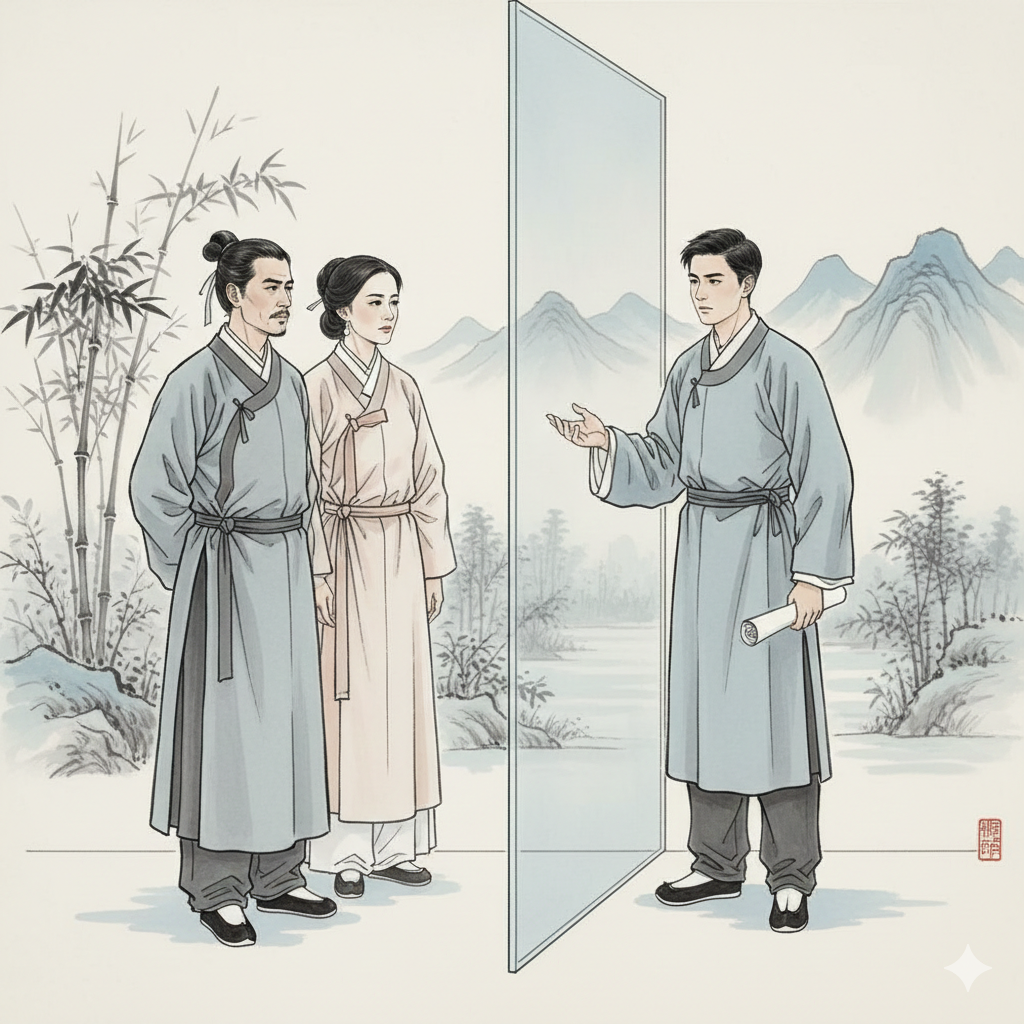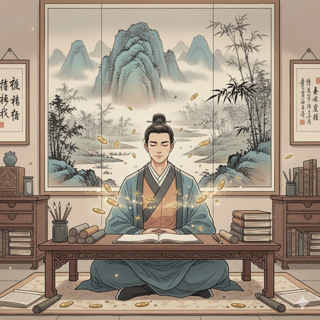 - 한글: 고즈넉한 동양 서재에 단정하게 옷을 입은 젊은이가 책상에 앉아 명상하듯 눈을 감고 있다. 책상 위에는 빛나는 고서적과 태블릿, 그리고 검소한 필기도구만이 놓여 있다. 창밖으로는 비 오는 도시 풍경이 펼쳐져 있지만, 그의 내면은 고요하고 충만하다. 배경에는 희미하게 황금빛 '지혜'와 '성장'이라는 한글 단어가 빛나며, 눈에 보이는 부유함보다는 내면의 가치에 집중하는 구글 나노 바나나 스타일의 동양화풍.