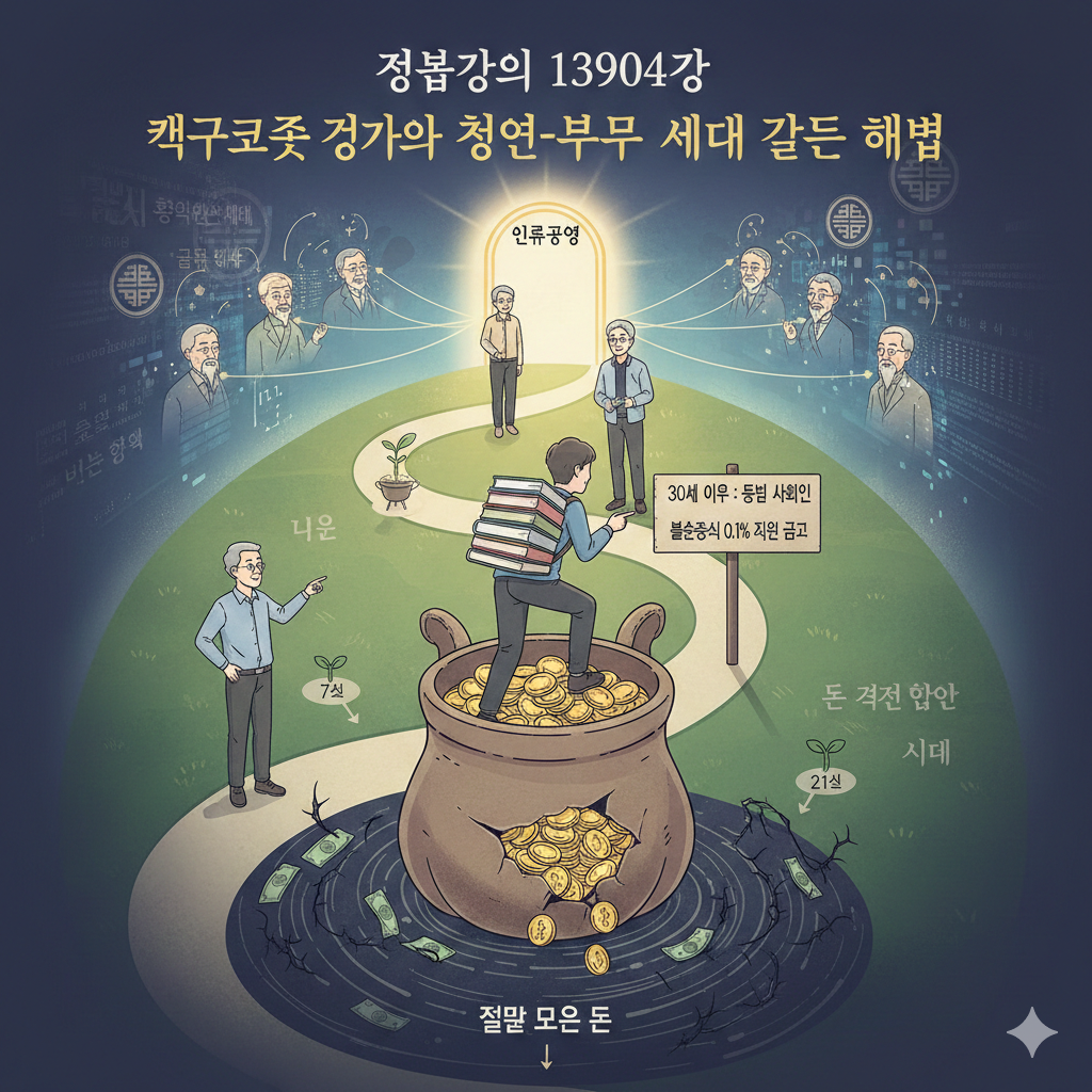 심층 분석의 종합적 시사점: 이 강의는 캥거루족 문제라는 현상을 통해, 우리 사회에 만연한 과잉 보호적 부모-자녀 관계, 그리고 물질적 풍요만을 추구하는 가치관에 대한 근본적인 성찰을 촉구합니다. 청년들에게는 수동적인 의존에서 벗어나 주체적으로 자신의 '질량'을 키우고 사회적 책임을 다할 것을 요구하며, 부모에게는 자녀의 독립된 삶을 존중하고 자신의 노후를 온전히 꾸려갈 지혜와 단호함을 주문합니다. 궁극적으로는 이러한 개인과 세대 간의 올바른 관계 재정립이 '인류공영'이라는 거대한 비전으로 연결된다는 통찰을 제시하는 강의라고 할 수 있습니다.