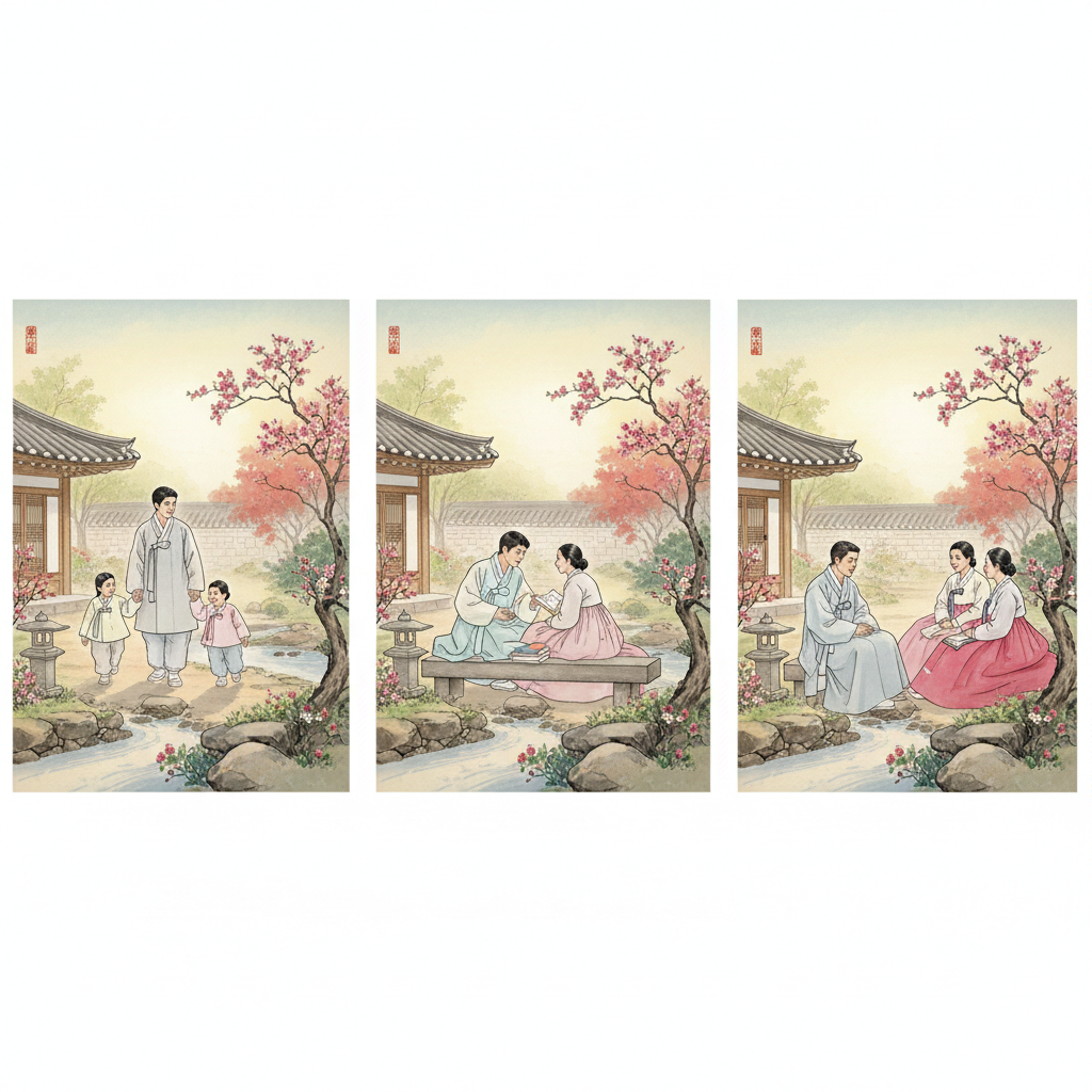 - 한글: 밝고 희망찬 동양화풍의 광야에서 단정하게 옷을 입은 젊은이들이 각자의 자리에서 작은 씨앗을 심고 있다. 그들 위로 따뜻한 햇살과 함께 '희망', '성장', '자립'이라는 한글 메시지가 황금빛으로 내려온다. 멀리 빛나는 대한민국 지도가 보이고, 부모 세대가 자애로운 미소로 이들을 지켜보는 구글 나노 바나나 스타일의 콜라주.