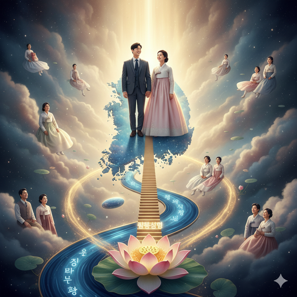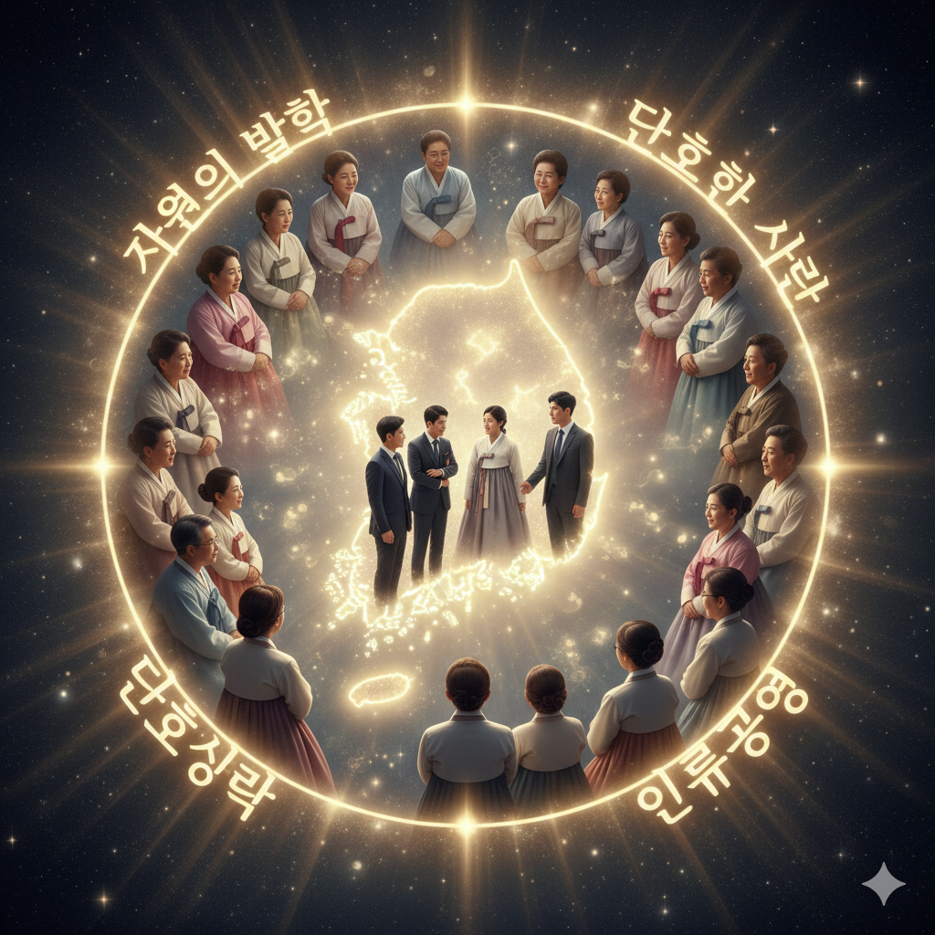 - 간단 생성 정보: 고요한 우주 공간에 빛나는 대한민국 지도가 떠 있고, 그 위에 단정하게 옷을 입은 다양한 연령대의 사람들이 원형으로 둘러앉아 서로에게 지혜의 빛을 나누고 있다. 그들 위로는 '공유', '성장', '동행'이라는 한글 글자들이 홀로그램처럼 떠오르는 동양화풍.