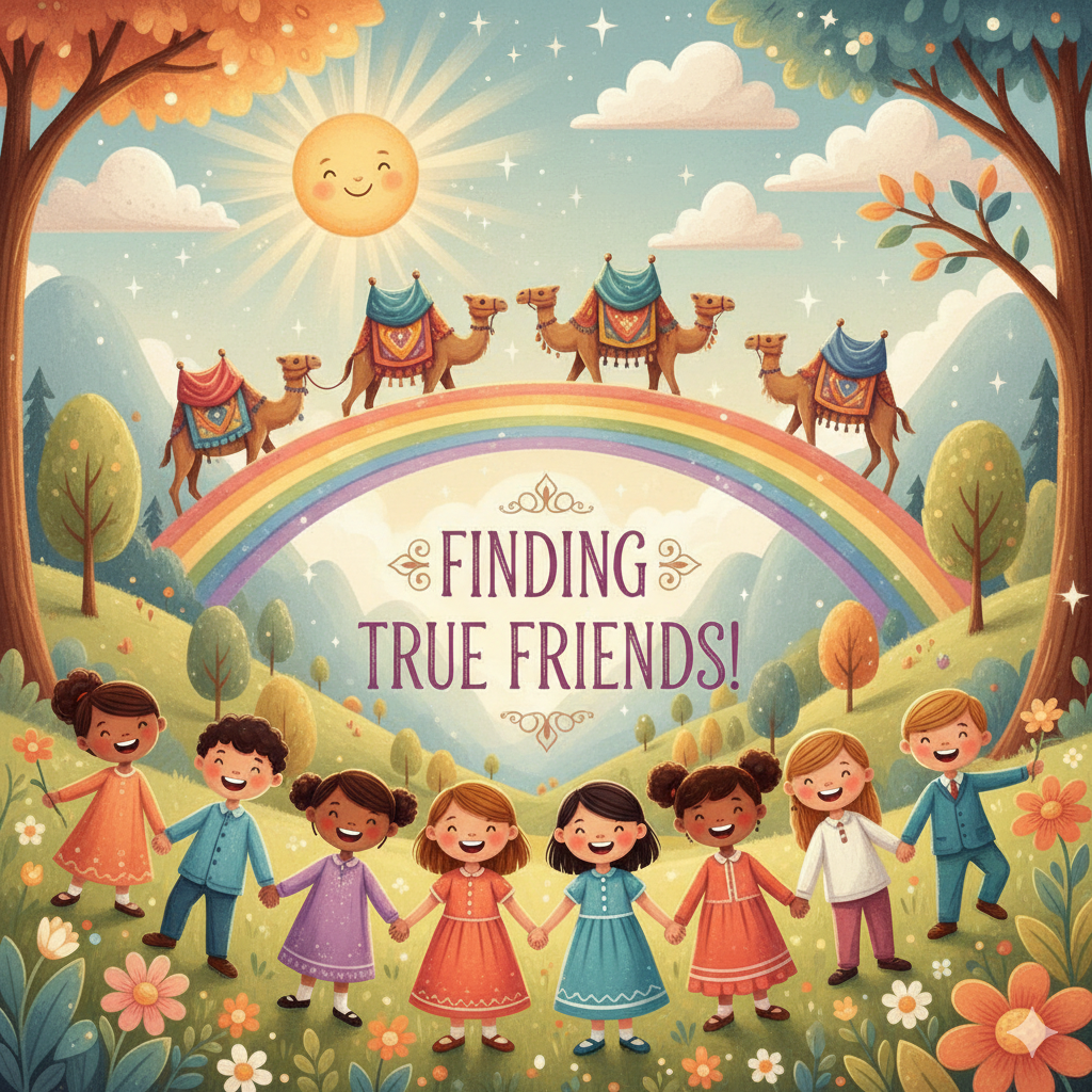 English: In a bright, fantastical fairy-tale style, the title "Finding True Friends!" is written in beautiful typography at the center. The image depicts various cheerfully smiling children holding hands, with a caravan of camels laden with colorful silks and jewels crossing a pastel rainbow bridge behind them. The overall atmosphere is warm and hopeful, rendered in a lovely, emotional Nano Banana-style collage. All children should be dressed in neat, brightly colored clothes. (Please ensure people are clothed neatly)