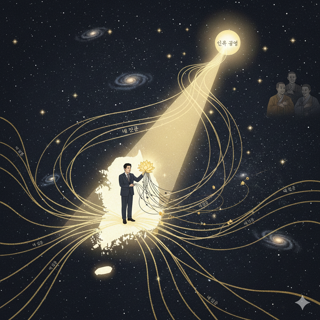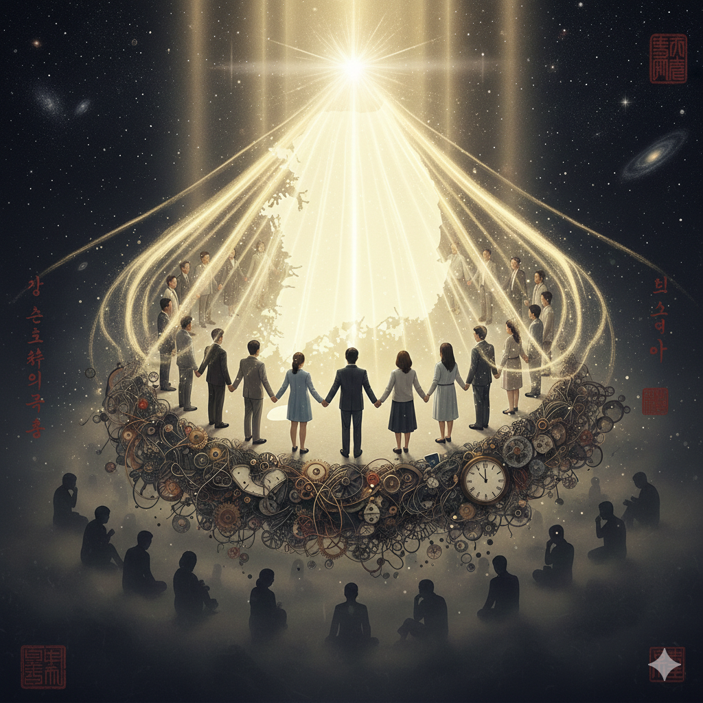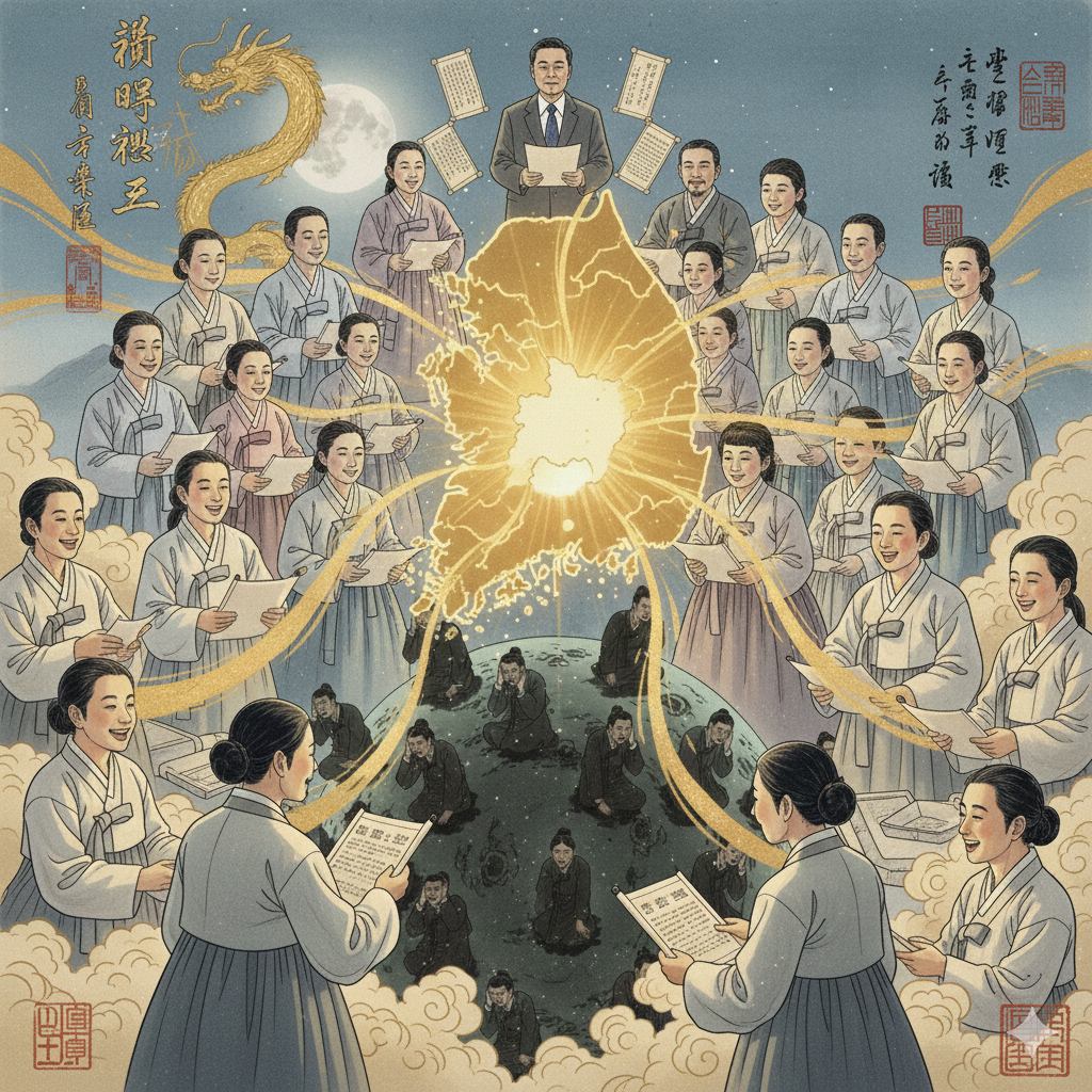 - English Prompt: In a serene, spiritual East Asian-style cosmic background, a luminous map of South Korea floats centrally. On the map, a neatly dressed individual radiates a golden lotus ('wisdom' symbol) from their chest. This light transforms dark threads labeled 'My Fault' into threads of liberation, extending as a grand beam towards 'human co-prosperity'. The light brightly illuminates countless stars (Cheonsons) in the sky. In the distance, figures representing 'Jewish people' and a 'Master' subtly smile towards the light. Everything is harmoniously connected in a hopeful and peaceful atmosphere. Nano Banana style, all figures are neatly dressed.