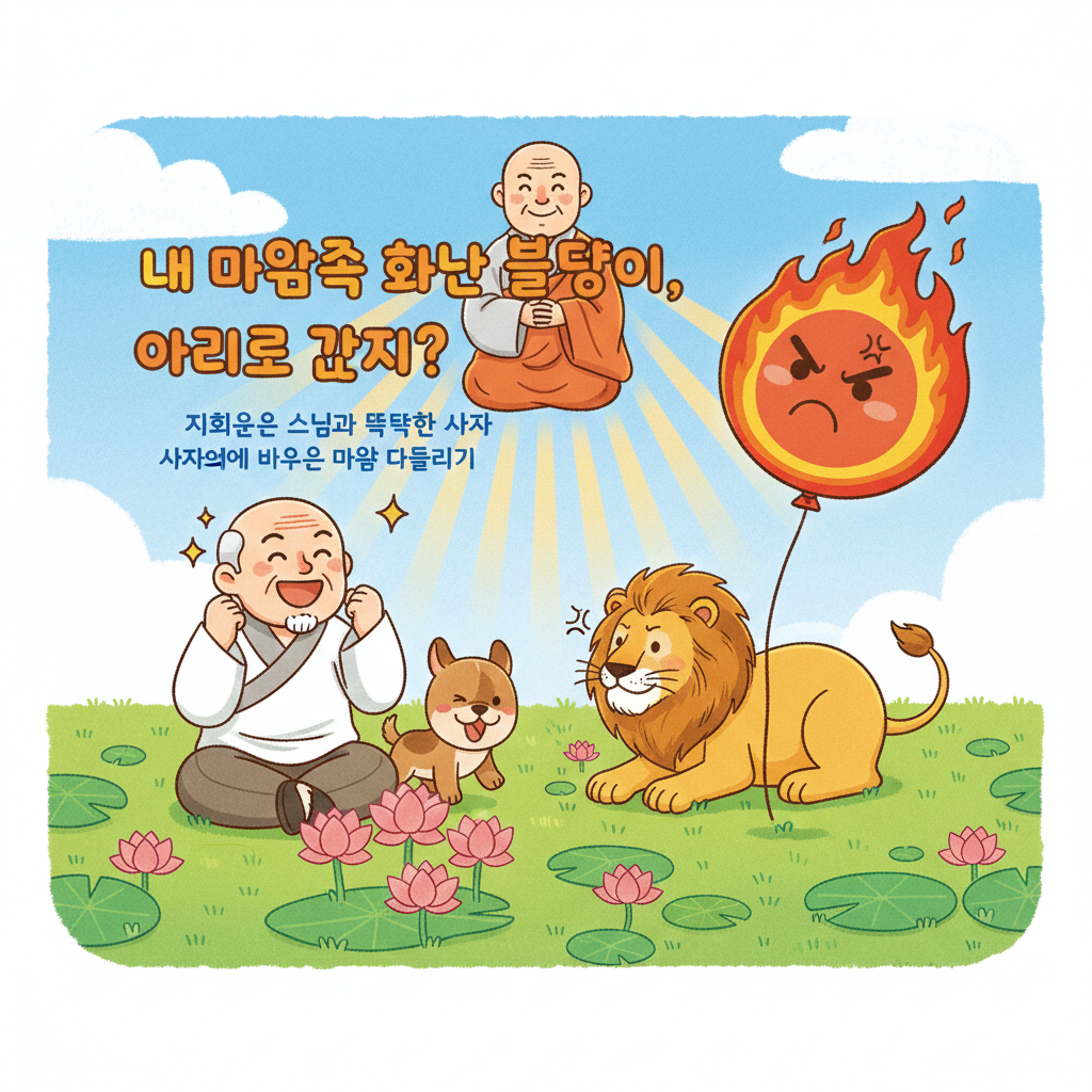 - 지혜의 전환(20초): 친근한 스님 캐릭터 등장. "잠깐! 화난 마음의 진짜 범인은 따로 있어!" 자막. "사자처럼 '왜 그럴까?' 하고 다시 생각해 봐!" -> 사자 캐릭터가 문제의 원인을 찾아내는 모습. (예: 친구는 왜 그런 말을 했을까? / 팀플이 망한 진짜 이유는?)