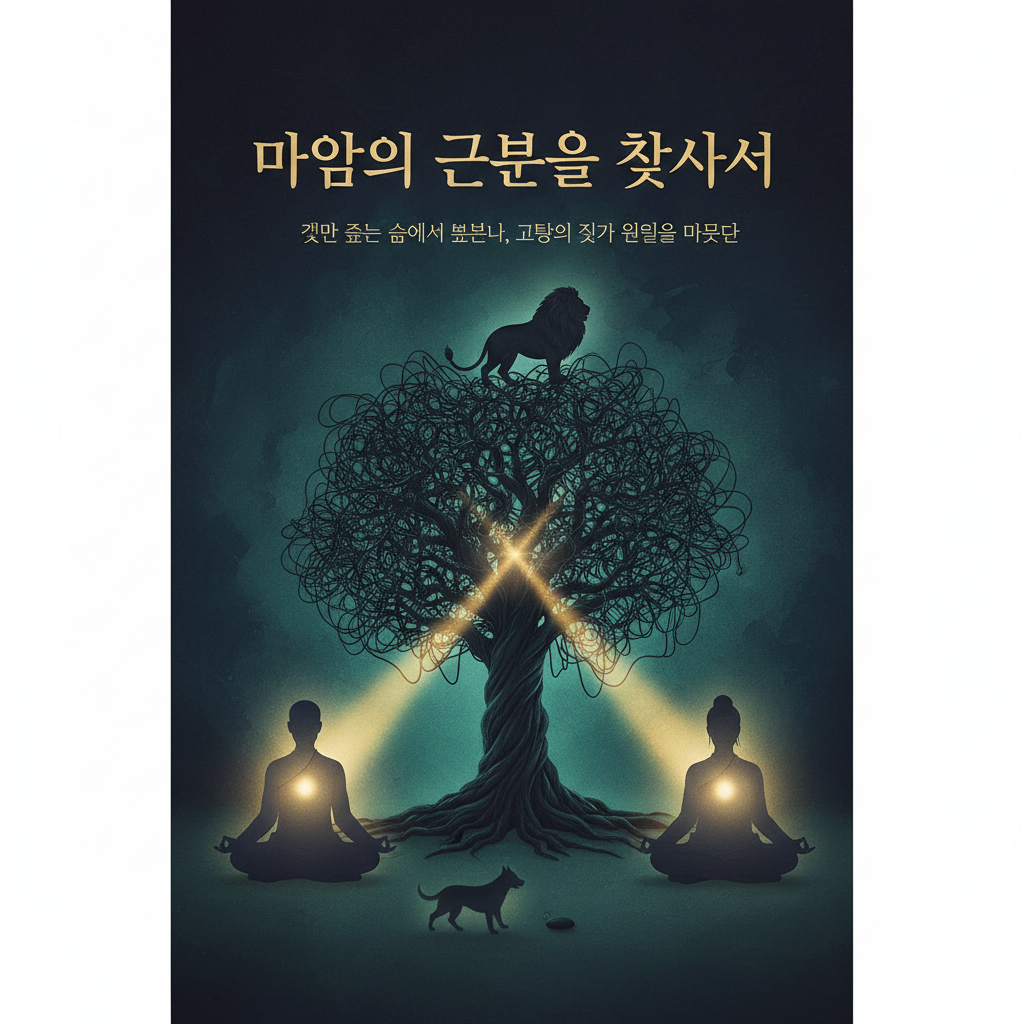 - 한글 이미지 프롬프트: 고급스럽고 현대적인 동양화풍의 전자책 표지. 어둡고 깊은 남색과 녹색이 어우러진 배경 위로, 고요히 명상하는 단정한 옷차림의 성인 남녀 실루엣이 투명하게 떠오른다. 그들의 심장에서 황금빛 지혜가 퍼져나가며, 배경에는 마치 실뿌리처럼 얽힌 번뇌의 선들을 뚫고 솟아나는 거대한 지혜의 나무 뿌리가 은유적으로 그려진다. 나뭇가지 위에는 고요하고 위엄 있는 사자가 앉아 멀리 응시하고 있고, 그 아래 작은 돌멩이 주변을 맴도는 흐릿한 강아지 실루엣이 대비된다. 제목 '마음의 근본을 찾아서'와 부제목 '겉만 쫓는 삶에서 벗어나, 고통의 진짜 원인을 마주하다'가 세련된 서체로 배치된다. 구글 나노 바나나 스타일.