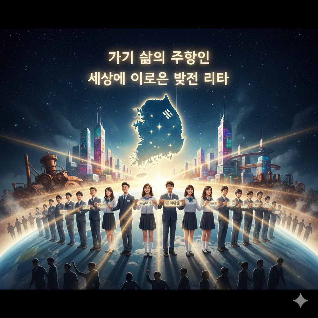 한글 프롬프트: 고요하고 영적인 동양화풍의 우주 공간, 그 중심에는 반짝이는 지구와 그 위에 힘차게 빛나는 대한민국 지도가 보인다. 지도의 중심에는 교복을 단정하게 입은 다양한 국적의 청소년들이 손을 잡고 밝게 웃으며, 기존의 '노동자'라는 낡은 이름표를 벗어던지고 '탐험 대장(연구원)'이라는 반짝이는 새 이름표를 달고 있다. 이 청소년들의 손에서 뿜어져 나오는 반짝이는 지식의 빛은 지구 전체로 퍼져나가며, 인류 전체의 '성장'을 이끄는 거대한 에너지 파동을 형성한다. 배경에는 낡고 녹슨 기계(옛날 산업)들이 사라지고, 알록달록하고 멋진 미래 도시의 모습이 펼쳐져, 모든 청소년들이 '자기 삶의 주인공'으로서 '세상을 좋게 만드는 멋진 리더'로 성장하는 희망찬 모습을 보여준다.