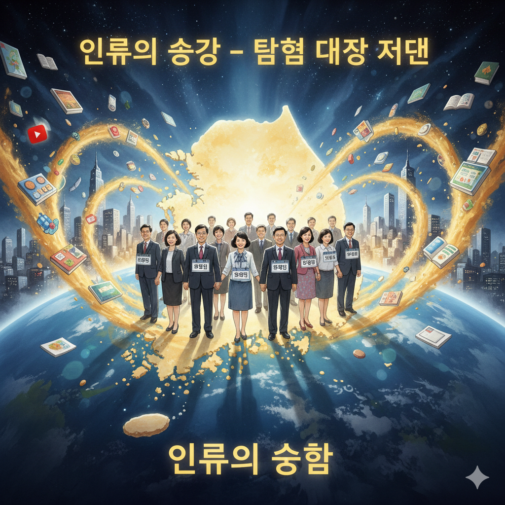 한글 프롬프트: 고요하고 영적인 동양화풍의 우주 공간, 그 중심에는 빛나는 지구 위에 우뚝 선 대한민국 지도가 보인다. 지도의 중앙에는 단정하고 현대적인 옷을 입은 다양한 연령과 국적의 사람들이 손을 잡고 밝게 웃으며, 기존의 '노동자'라는 낡은 이름표를 벗어던지고 '탐험 대장(연구원)'이라는 반짝이는 새 이름표를 달고 있다. 이 사람들이 가진 지혜의 빛은 지구 전체로 퍼져나가, '인류의 성장'을 이끄는 거대한 에너지 파동을 형성한다. 이 파동 속에서 전자책, 유튜브 로고, 교재 이미지, 음악 악보 등 다양한 콘텐츠 형태의 아이콘들이 떠오르며, 미래 도시의 실루엣과 긍정/부정 시나리오를 상징하는 명암 대비가 어우러져 희망과 도전이 공존하는 모습을 표현한다.