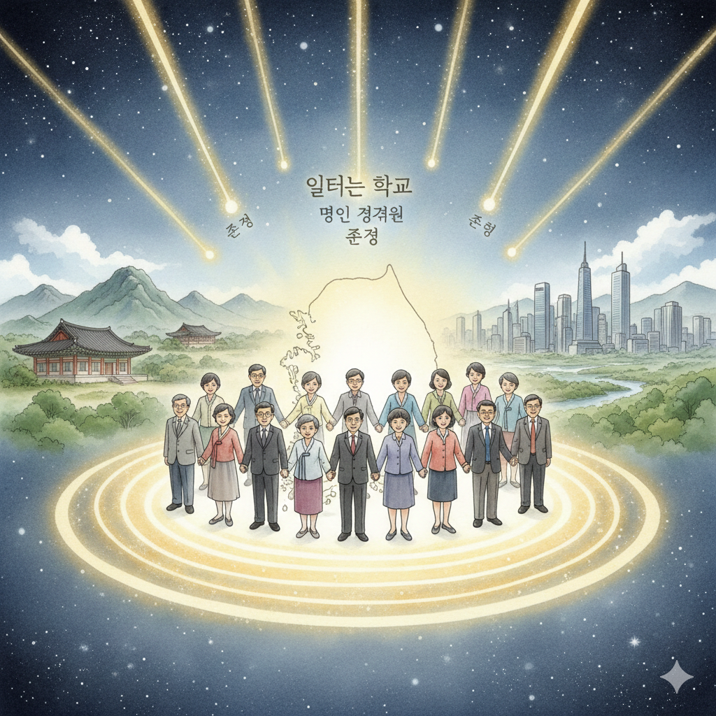 - English: A serene and spiritual East Asian style cosmic space. At its center, a brilliantly shining map of South Korea floats. On this map, neatly dressed individuals of various ages and professions stand shoulder-to-shoulder or hand-in-hand, smiling brightly. Above them, Korean words like 'Workplace is School', 'Master Researcher', 'Respect', 'Wisdom', and 'Human Prosperity' fall like luminous shooting stars, forming a grand aura of light. The background is a harmonious collage of tranquil mountain temples, futuristic cities, and vast natural landscapes, emotionally portraying a hopeful future where individual growth, societal prosperity, and cosmic harmony intertwine, in an East Asian style collage. All figures have calm and wise expressions.