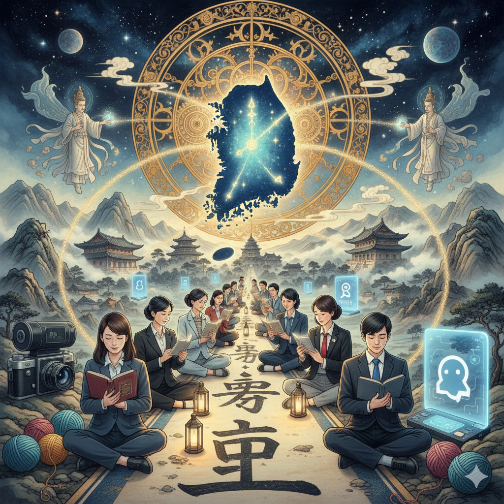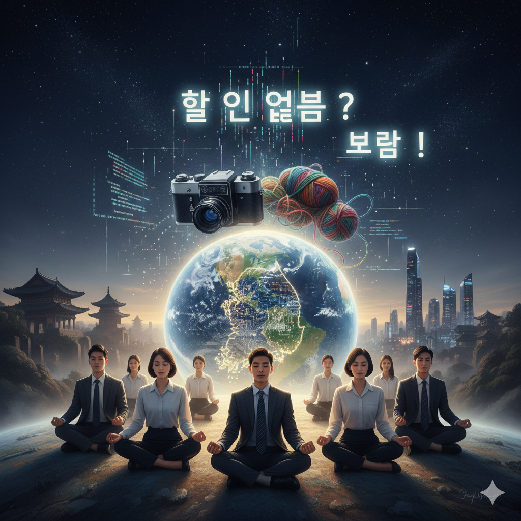 - 이미지 묘사: 고요하고 영적인 동양화풍의 우주 공간. 중앙에 빛나는 대한민국 지구가 떠 있고, 그 위로 AI 코딩 이미지와 낡은 필름 카메라, 뜨개실이 조화롭게 콜라주되어 있다. 지구 위에는 단정하고 현대적인 옷을 입은 젊은 남녀가 명상하는 자세로 앉아있고, 그들 머리 위에는 '할 일 없음', '보람'이라는 한글 단어가 물음표와 느낌표처럼 빛난다. 우주의 배경에는 희미하게 과거와 미래 도시의 실루엣이 교차한다.